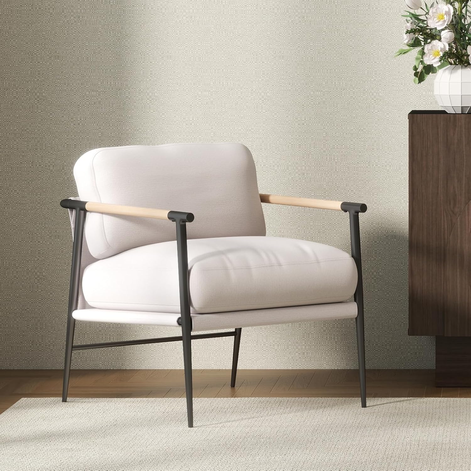 Mid-Century Accent Chair, Soft Armchair Chenille Fabric Lounge Chair with Black Metal Legs, Upholstered Leisure Chair for Living Room Bedroom Reception Room, 1PC, Beige
