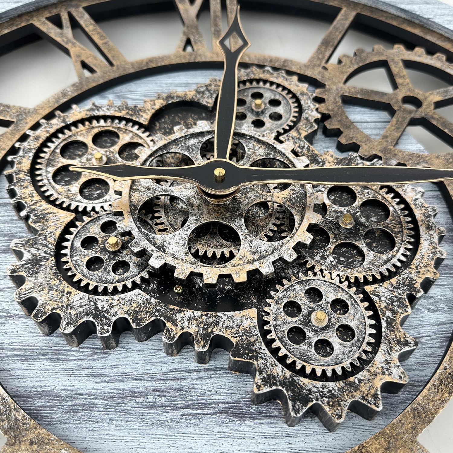 - ăReal Moving Gear ClockăAll gears for the wall clock are real moving! Design with rustic bronze-color and industrial style. An creative combination of four gears for a retro look, has a very exquisite decorative effect makes the wall clock become a chic art works. The large wall clock crafted of nature wood & MDF. Big roman numeral numbers and wood rustic moving gears perfect for any room decor.