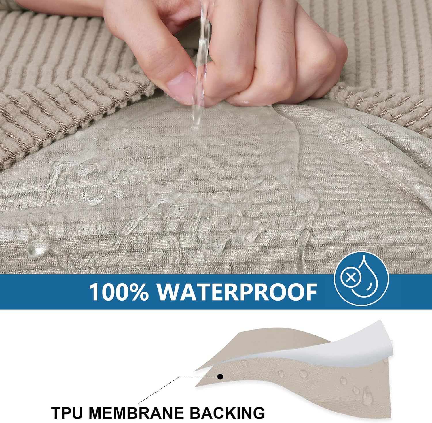 - [100% Waterproof Fabric] The back of the couch seat cover has a waterproof layer made of TPU. Great on against spills, pets' fur, stains, and normal wear and tear or any possible mess and accidents.