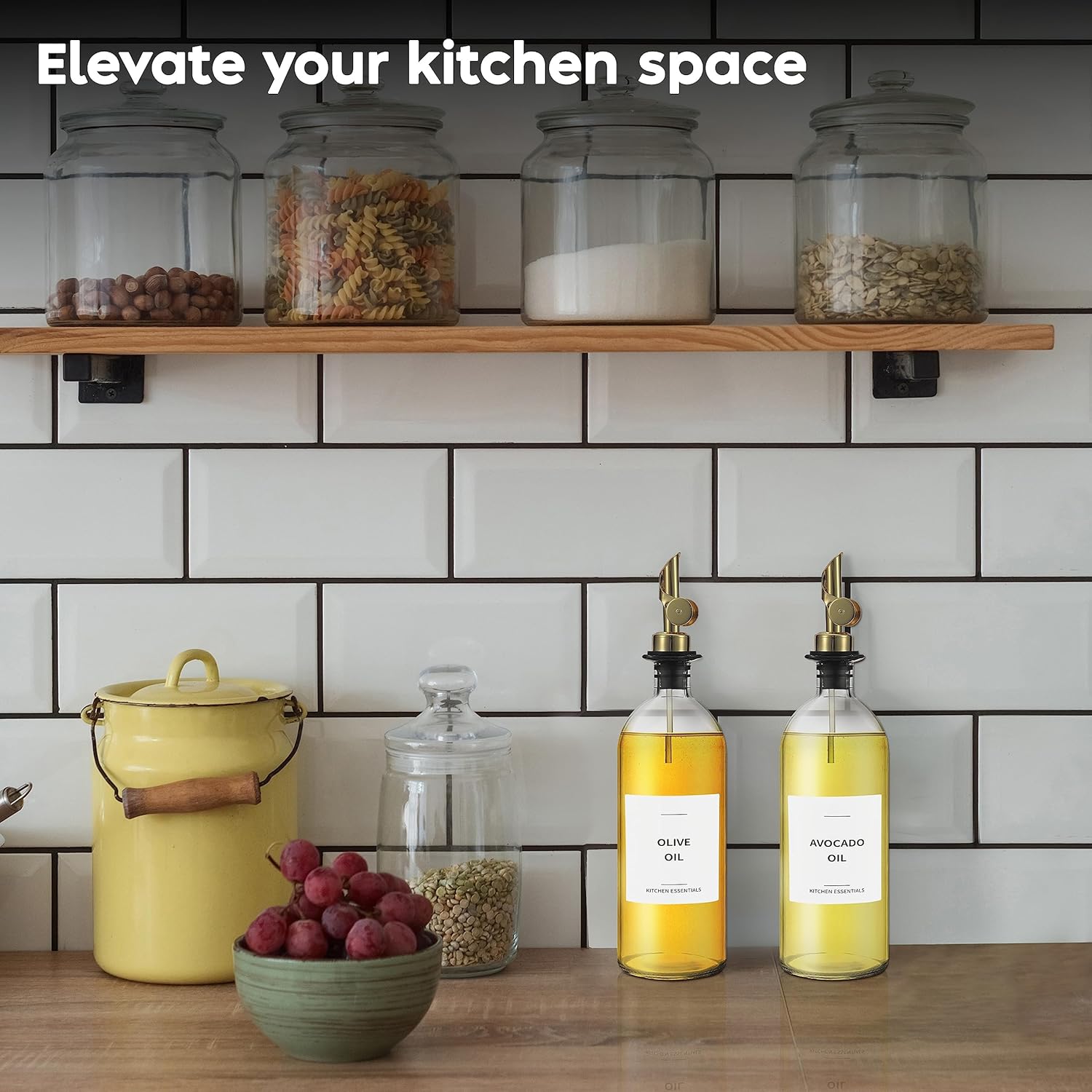 - Includes 55 Sticker Labels — Customize your glass oil dispenser thanks to the complimentary 55 waterproof and oil proof sticker labels made from PVC. Each label is minimalistic and clearly shows the contents of the bottle for convenience and decor.