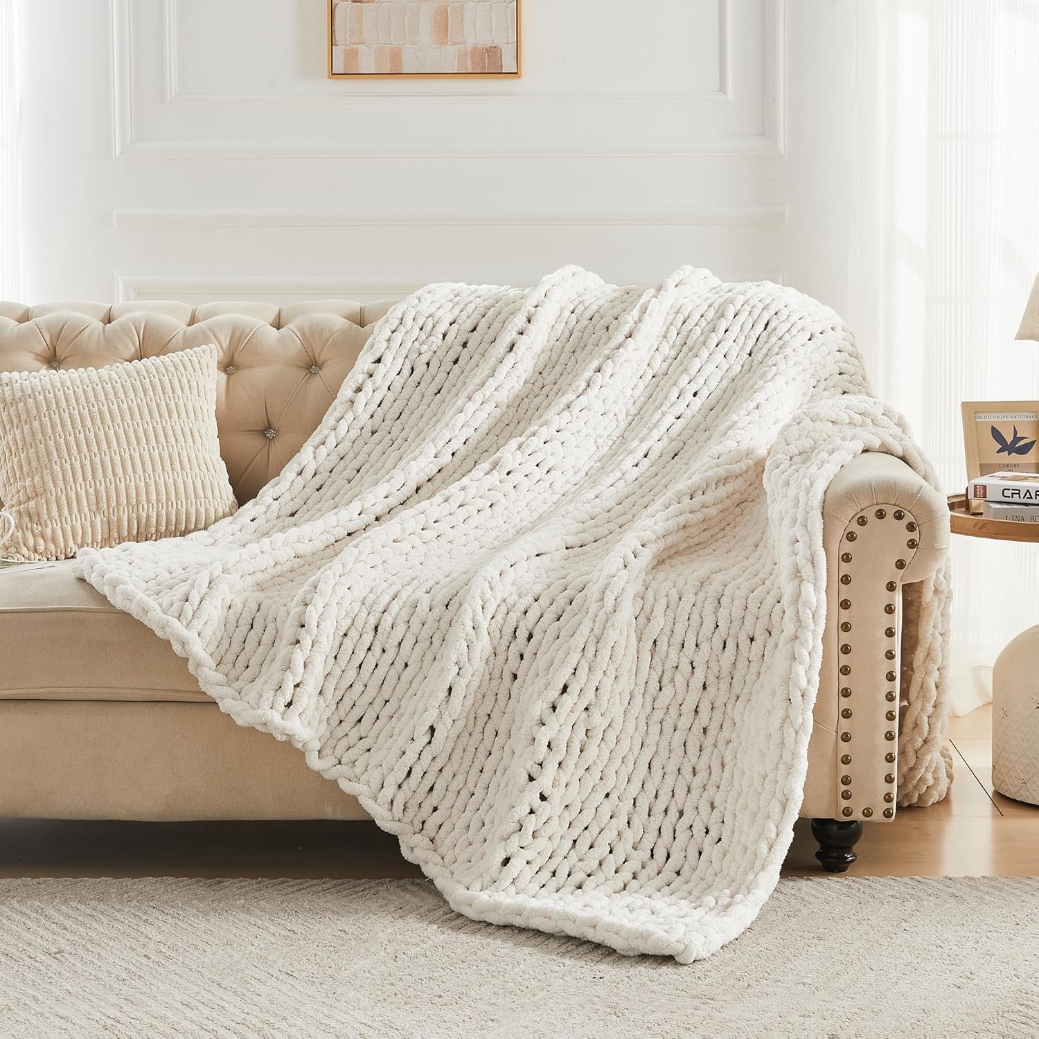 Carriediosa Chunky Knit Throw Blanket 60" X 80" Twin, 100% Hand Made Large Chenille Loop Yarn Soft Fluffy Throws for Couch Sofa Bed, Big Crochet Cozy Heavy Thick Cable Woven Blankets, Cream White