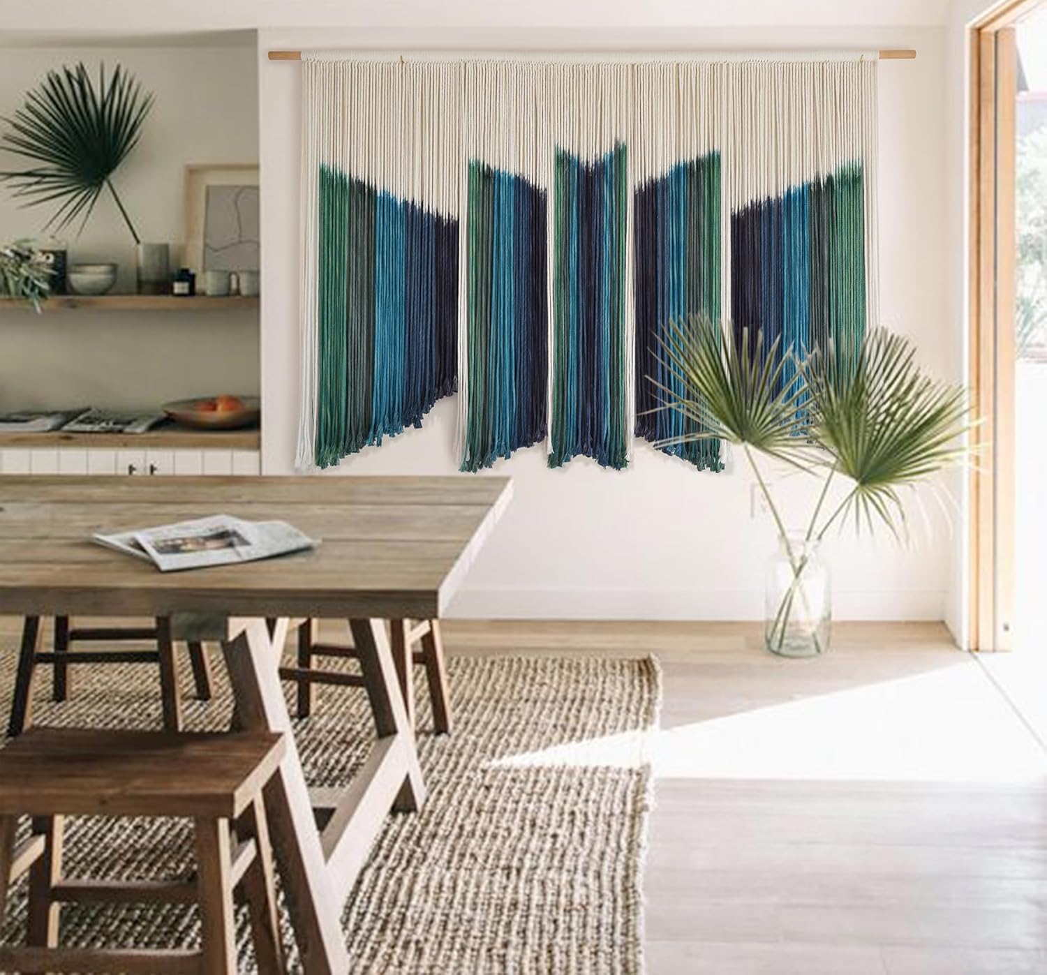- 【Dimensions】: 59"L across X 37" W-(approximate length from the top of the stick to the tip).Color: The blue/green macrame wall hanging is designed with geometric natural patterns with 5 various color combinations that make the eyes light up.