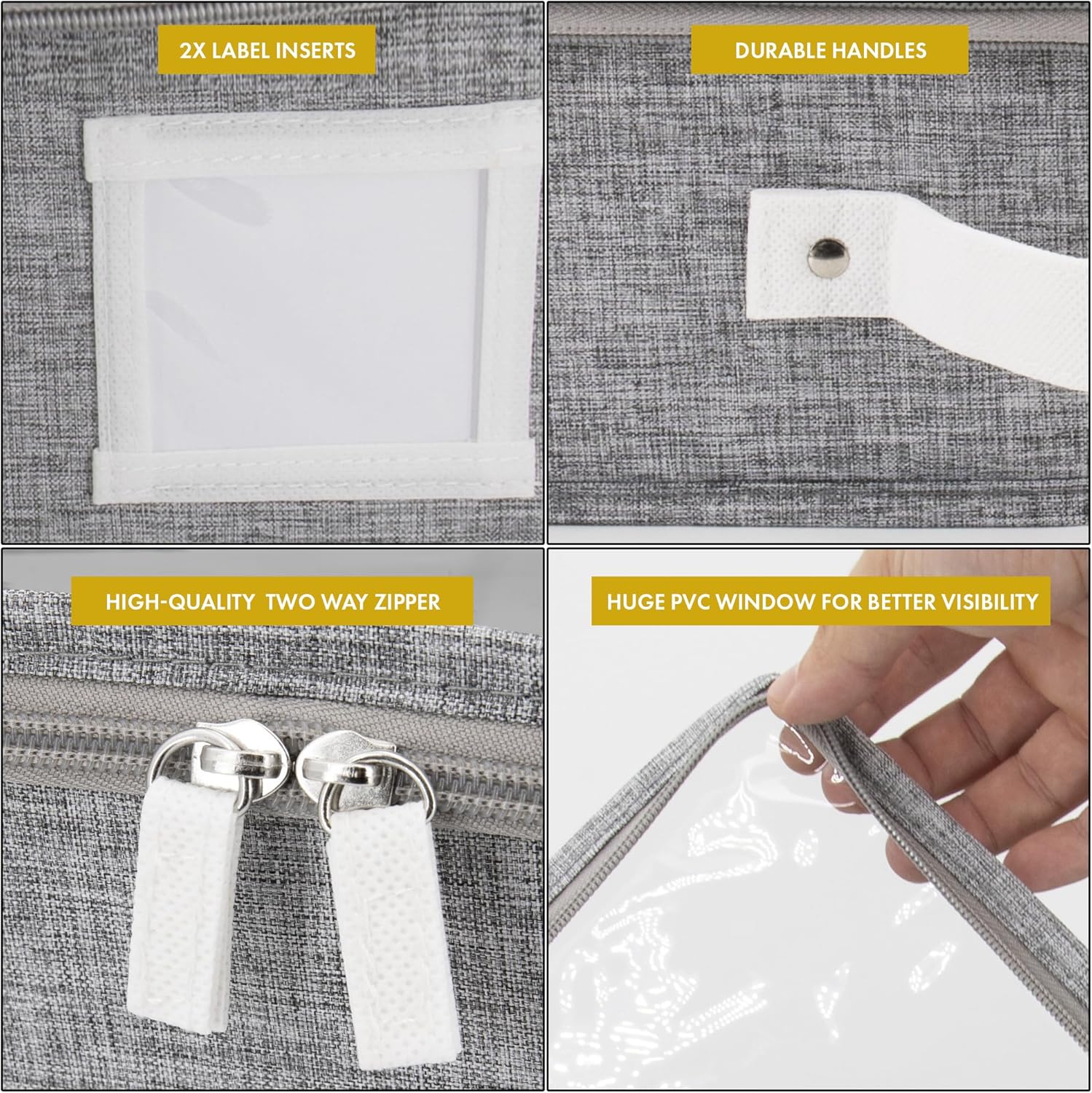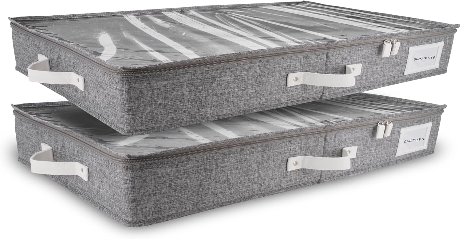 - 𝐃𝐨𝐮𝐛𝐥𝐞 𝐒𝐞𝐜𝐮𝐫𝐞 𝐇𝐚𝐧𝐝𝐥𝐞𝐬 𝐖𝐢𝐭𝐡 𝐇𝐞𝐚𝐯𝐲 𝐃𝐮𝐭𝐲 𝐙𝐢𝐩𝐩𝐞𝐫 𝐂𝐥𝐨𝐬𝐮𝐫𝐞: Our storage boxes with lids for organizing comes with 3 fortified handles for secure lifting & powerful zipper for durable sealing. The handles of these low profile underbed storage are precisely stitched inside out, with additional rivets to hold up to 35 lbs for heavy-duty use making it ideal to use as flat clothing storage. To enhance safety, our under bed flat storage boxes are expertly tailored to keep your clothes protected.