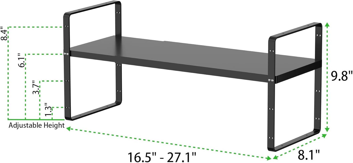 - Adjustable Shelves: This cabinet shelf organizer extends in length and adjusts in height to fit any space you need. The original shelf (collapsed) measures 16.5" L x 8.1" W x 9.8" H. The length can be extended from 16.5 inches to 27.1 inches. This expandable cabinet shelf provides four levels of board height adjustment. You can tailor each shelf with adjusting screws on both sides of the shelf frame