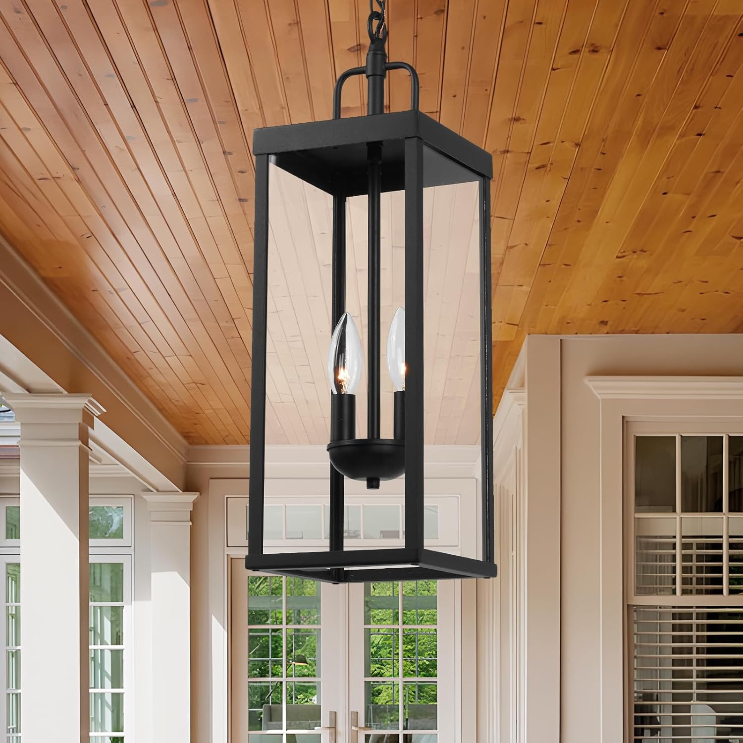 Large Outdoor Pendant Lantern Light Fixture for Front Porch, 20 Inch 2-Light Black Exterior Hanging Chandelier with Clear Glass, Outdoor Indoor Pendant Lamp for Patio, Gazebo, Entryway, Doorway