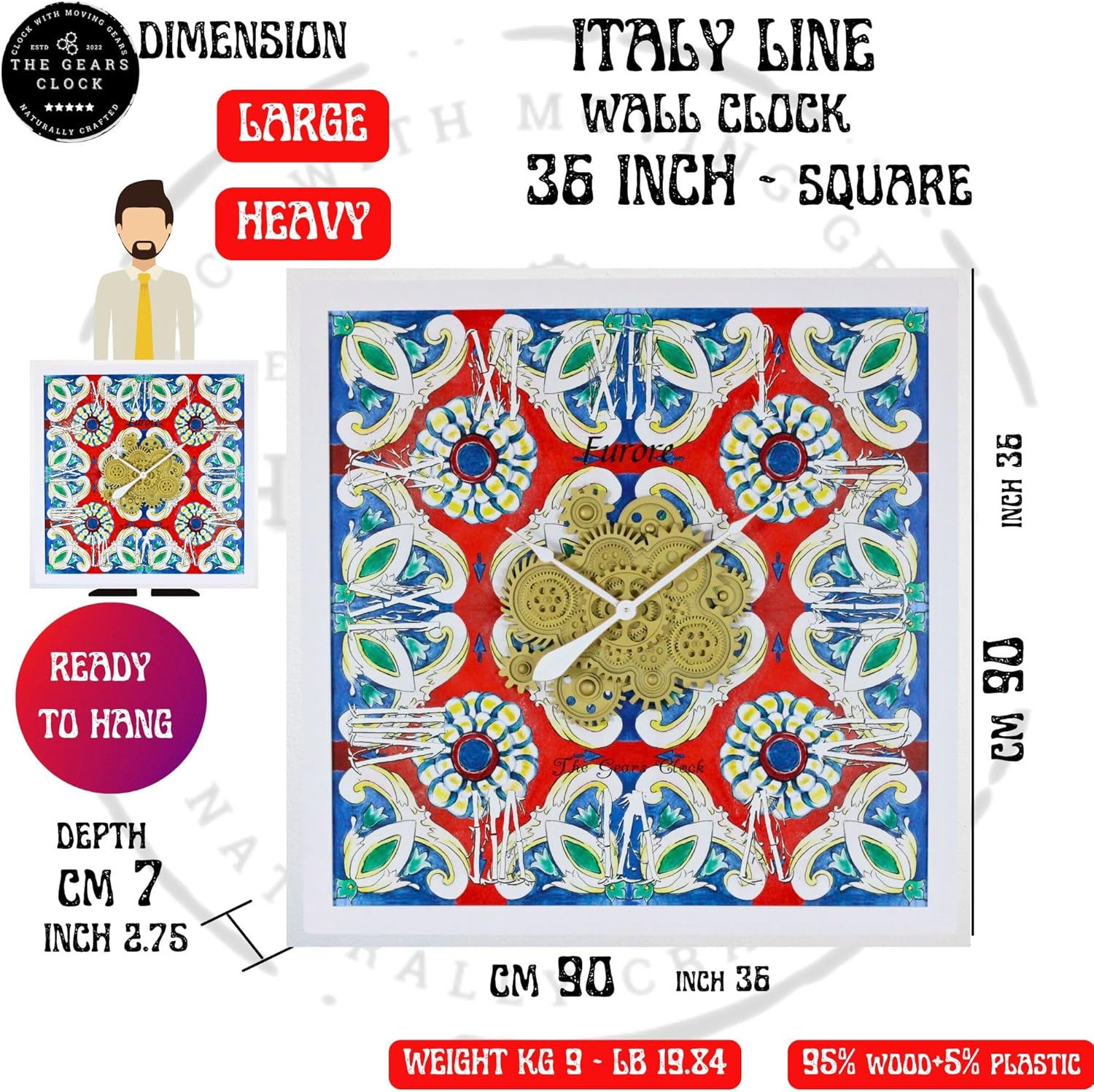 The Gears Clock Wall Clock Italy Collection with Moving Gears (Amalfi, 36 inch Square)