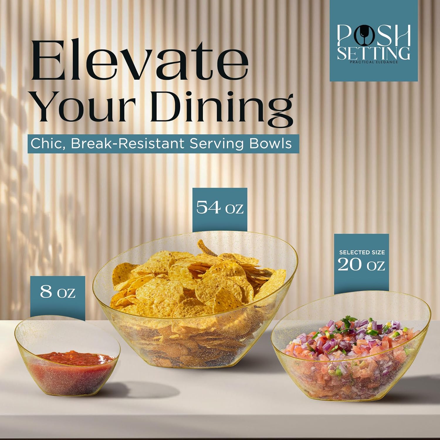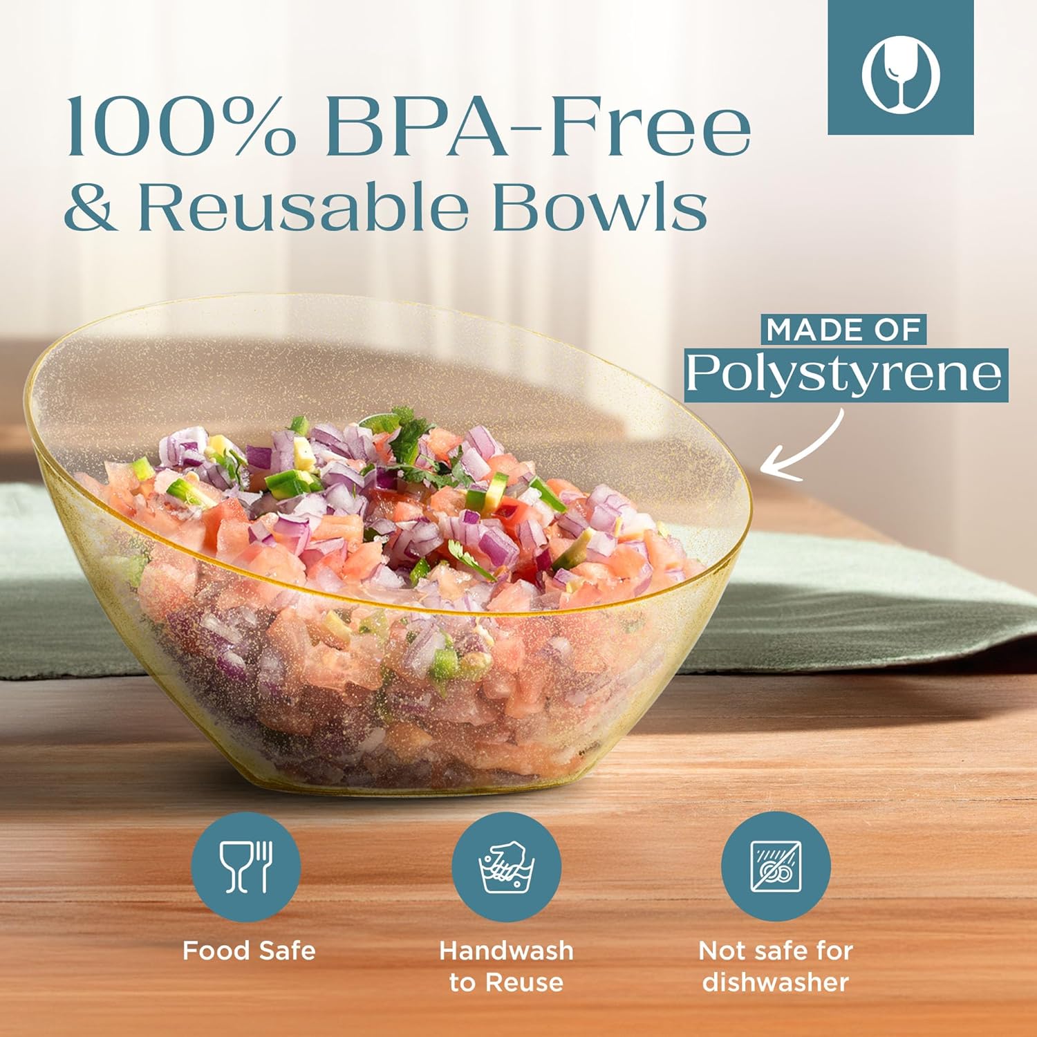 Posh Setting Gold Plastic Serving Bowls - Angled, Disposable for Chips, Candy, Salad, Fruit - Wedding Party Table - Gold Glitter, 20 OZ, 5 Pack