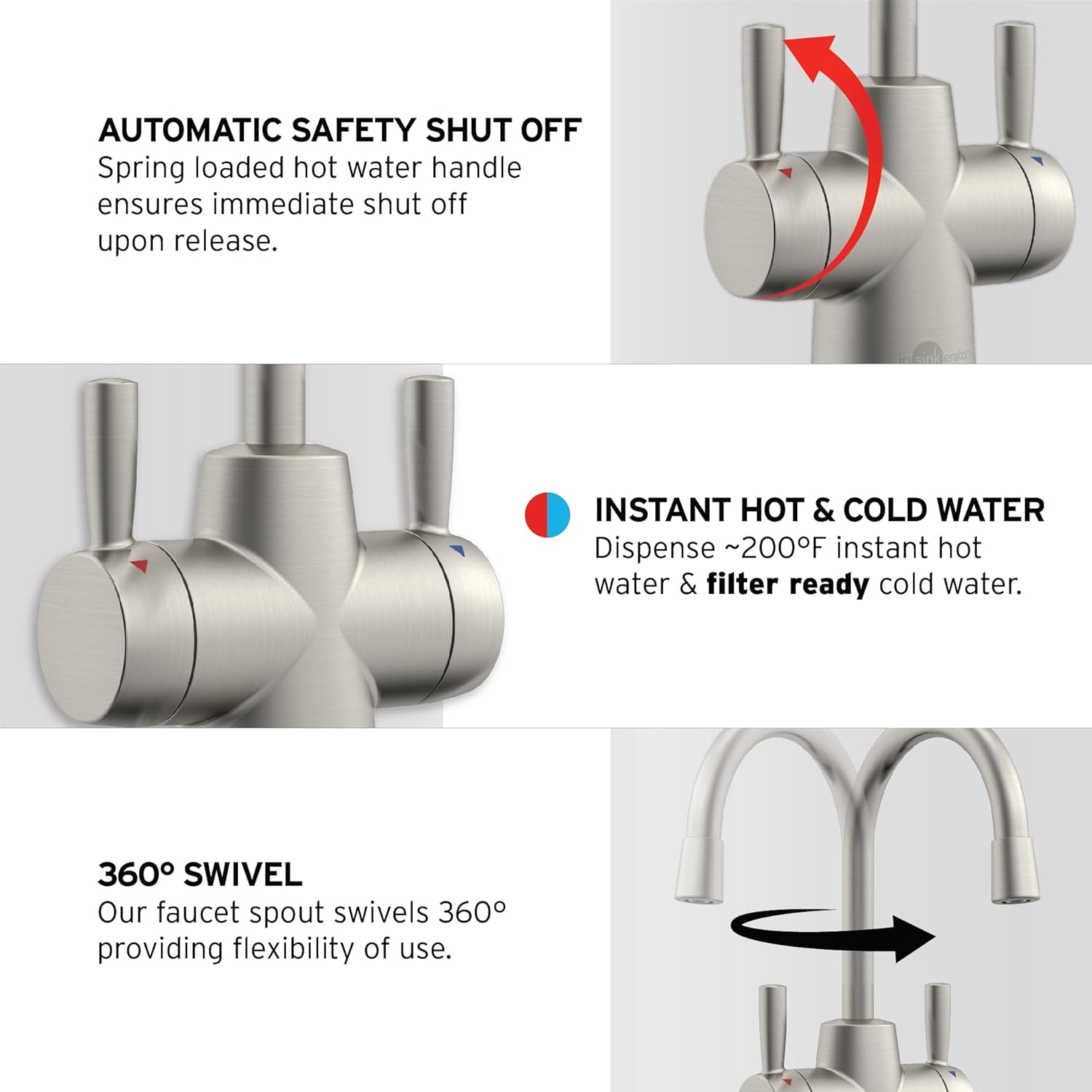 - FILTER-READY COLD DRINKING WATER FAUCET: Option to add an InSinkErator water filter to instant hot water heater and dispenser, ensuring hot and cold drinking water tastes and smells great and improving water quality by reducing harmful impurities
