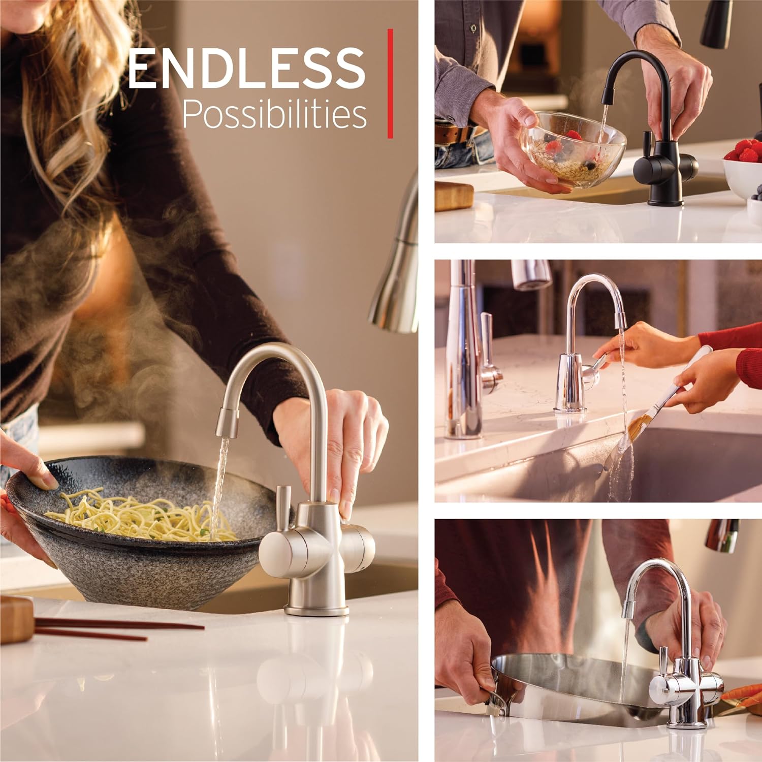 - ON-DEMAND, NEAR-BOILING WATER: Instant hot water (approximately 200 degrees F) right next to the main kitchen faucet when you need it, for cooking, cleaning, and more; a time, space, and energy saver that lets you get on with more important things in life