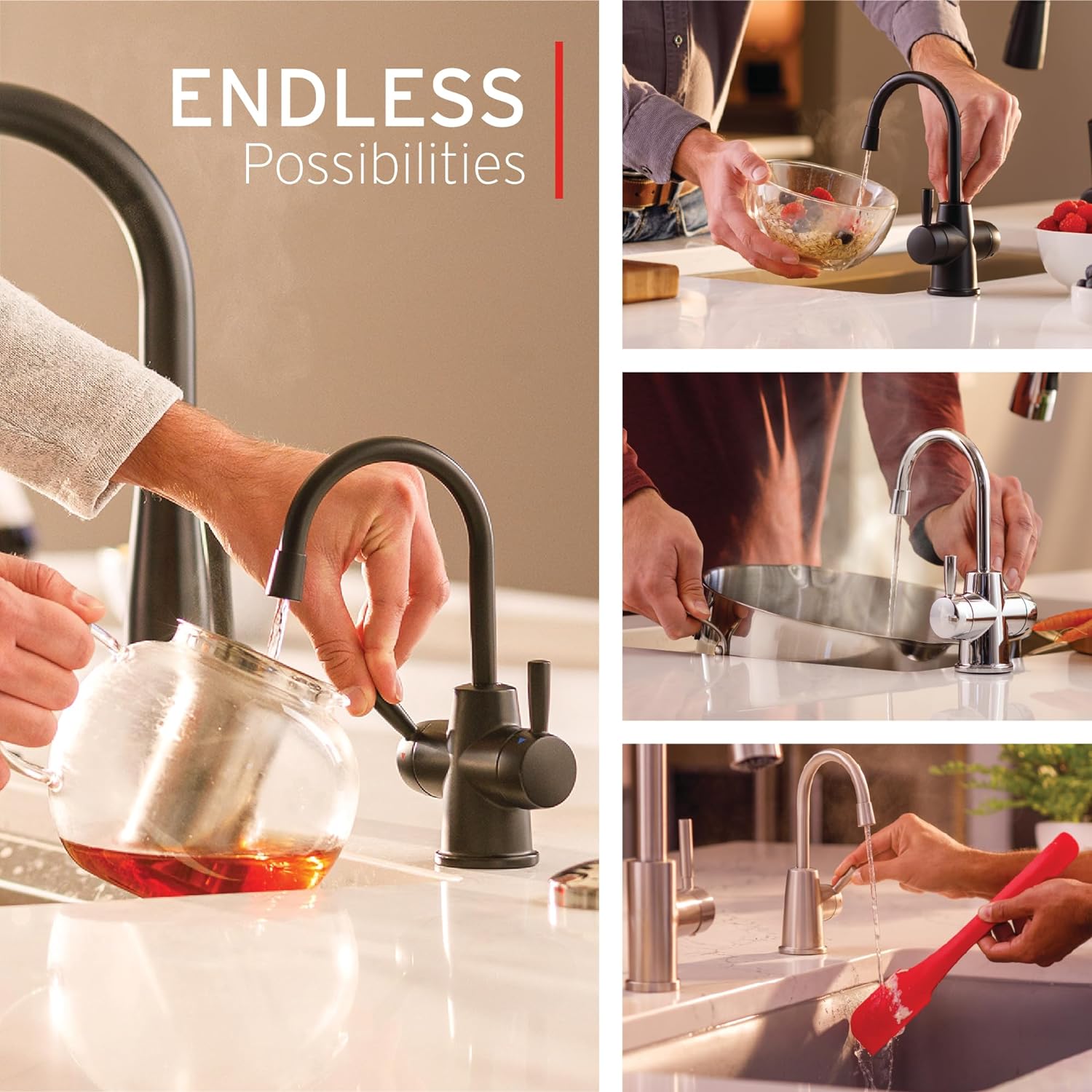 - ON-DEMAND, NEAR-BOILING WATER: Instant hot water (approximately 200 degrees F) right next to the main kitchen faucet when you need it, for cooking, cleaning, and more; a time, space, and energy saver that lets you get on with more important things in life