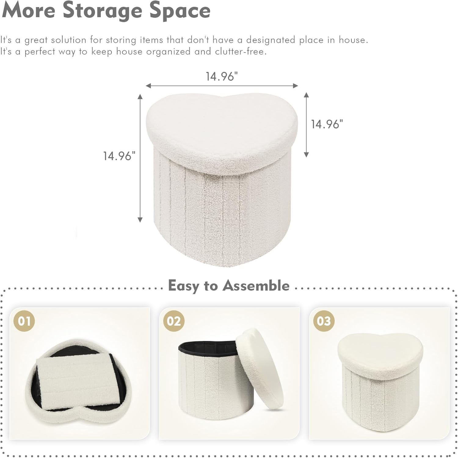 B FSOBEIIALEO Storage Ottoman Cube, Heart Shaped Ottomans with Storage Foot Stool Footrest for Lving Room, Boucle Ottoman Seat for Dorm Room,Faux Teddy Fur, Cream White 15"x15"x15"