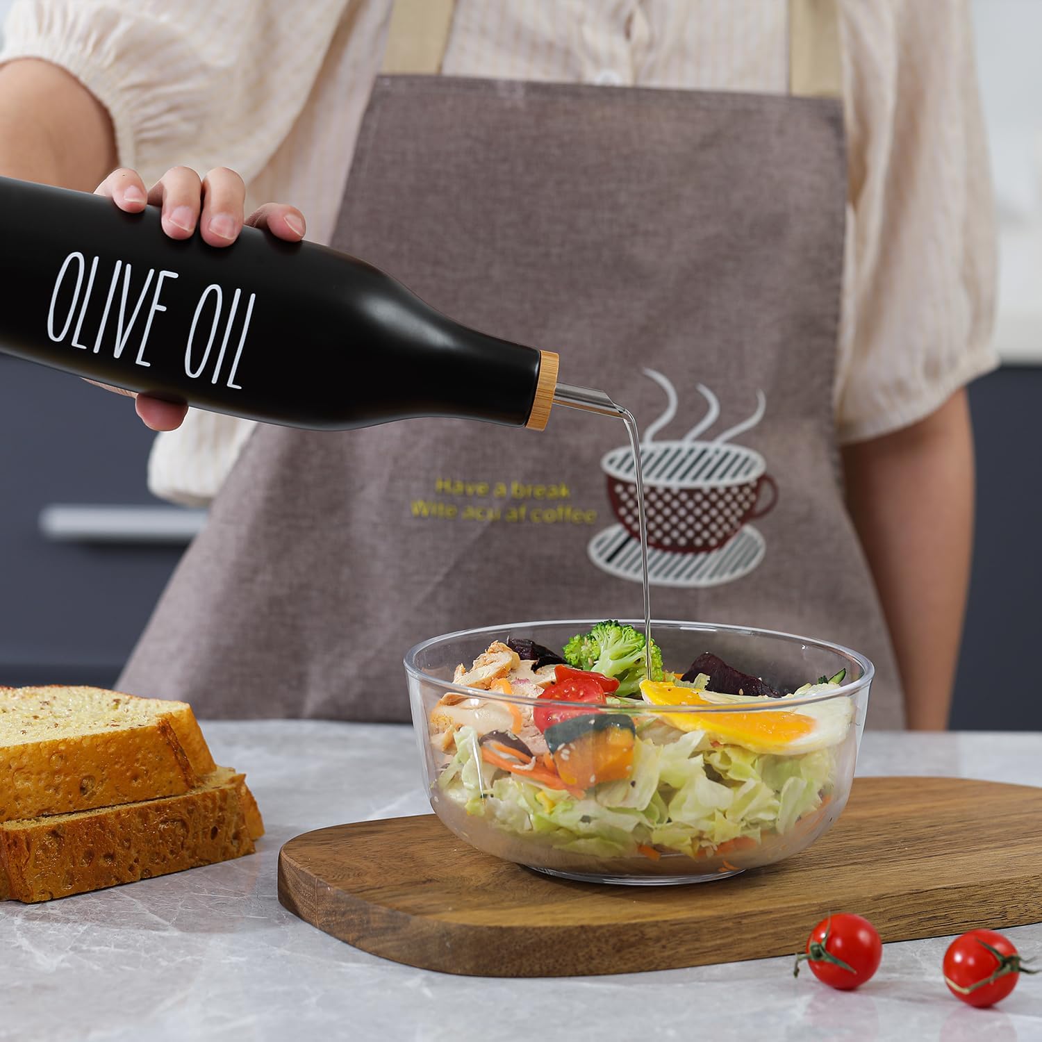 - Ceramic Oil Dispenser: 16.9oz Olive Oil Cruet Bottle with Bamboo Cap and Stainless Steel Spout