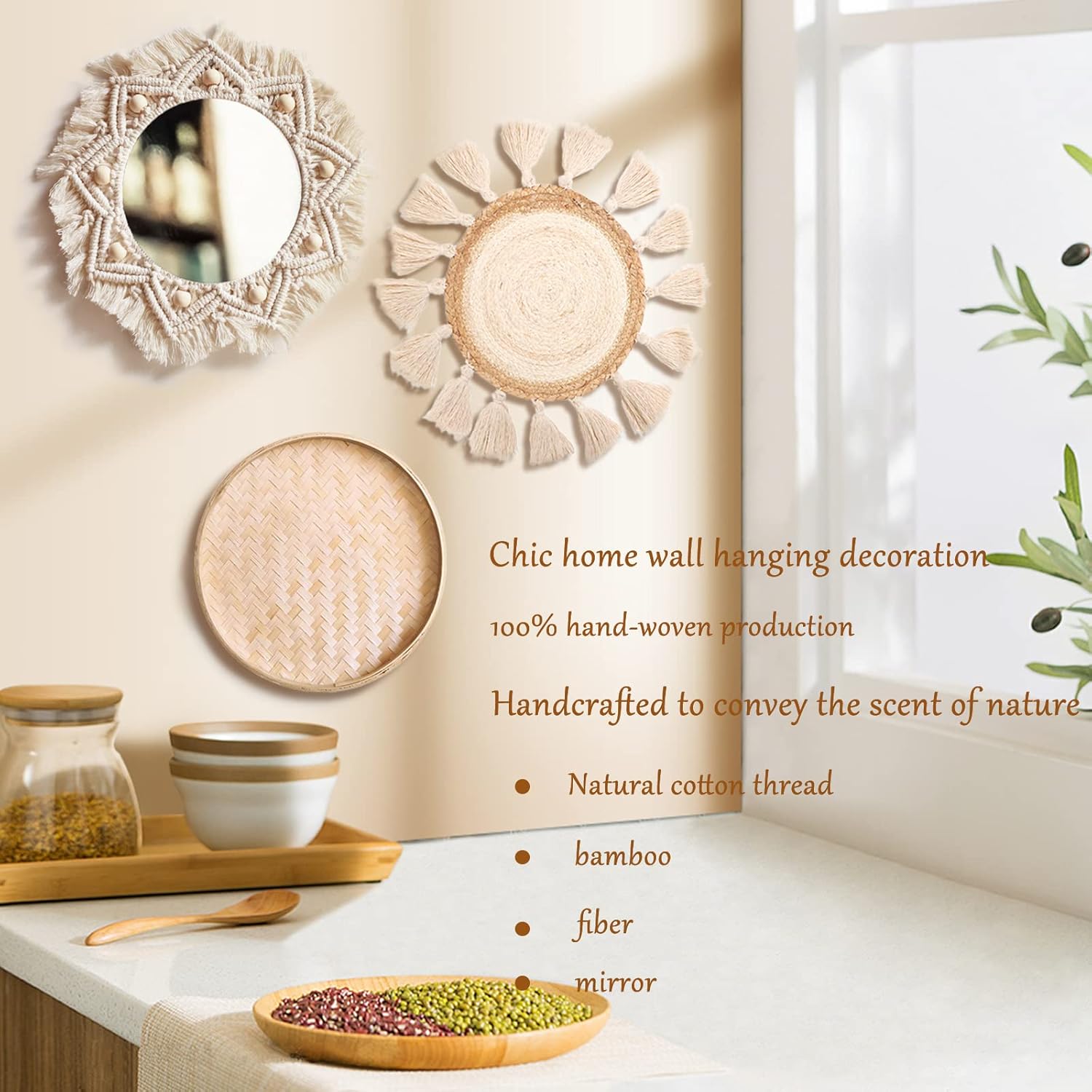 - 【Exquisite Wall Decor】: This simple bohemian wall hanging set is the most classic match, perfect for hanging in living room, dining room, kitchen, bedroom, dorm room, fireplace and other prominent walls, also can be combined with any bohemian style woven wall decorations, such as rattan, wicker, bamboo, sea grass, etc. You will love it.