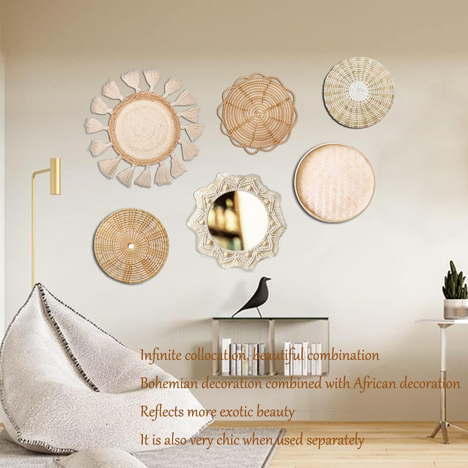 - 【Value Combo Set】:The product is a combination of boho macrame mirror and tassel placemat pendant with bamboo tray woven wall basket decoration, combined into an beautiful set of decorative aesthetic wall art.