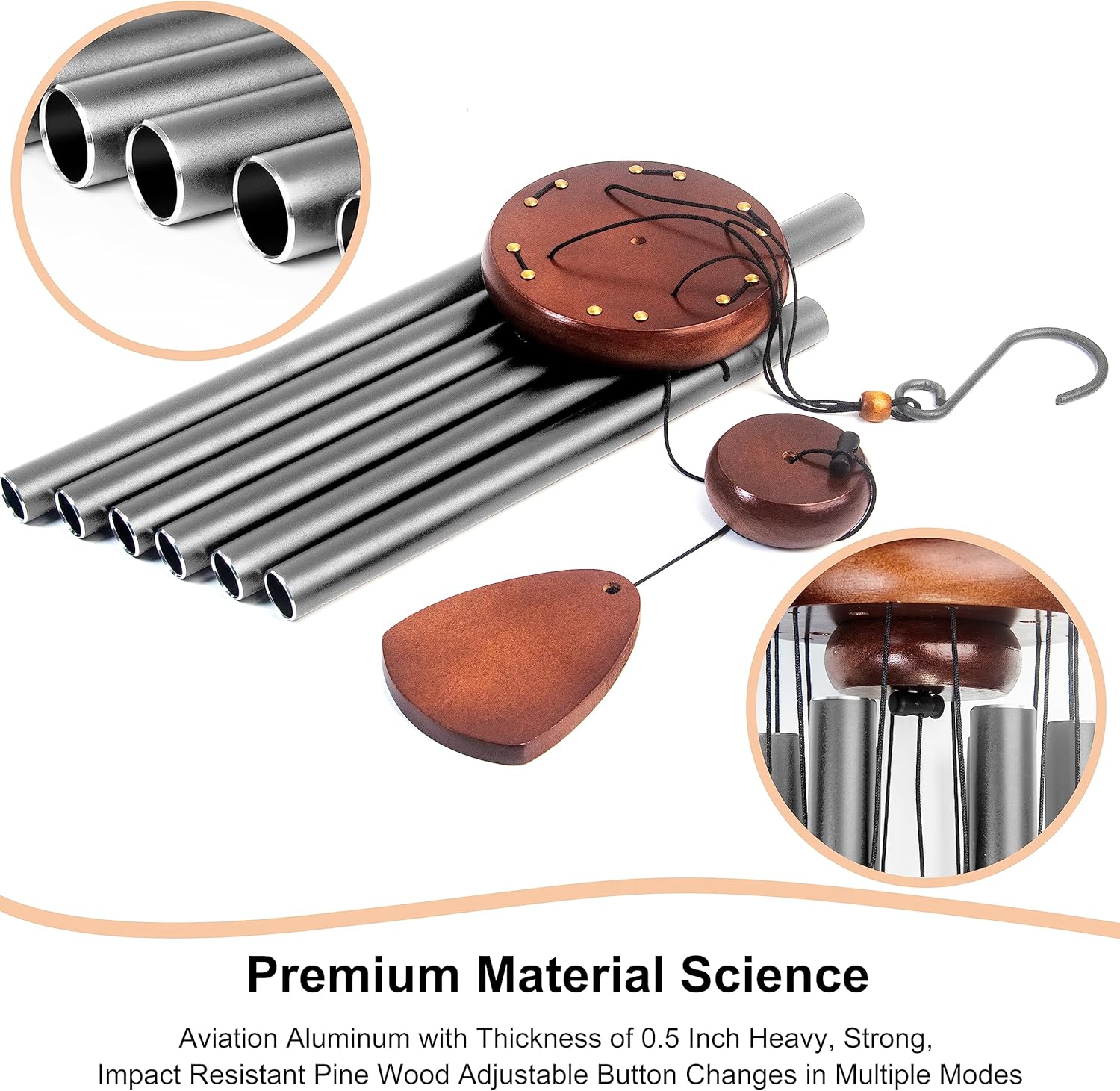 - 🎵[Large Wind Chimes Size]: The windchime is made of premium aluminum pipe and pine. The total length of the wind chimes from the top's S-shaped hook to the bottom's catcher is 37" Among them, 6 classic silver-gray anodized aluminum tubes have excellent corrosion resistance and wear resistance, and the length ranges from 8.7" to 12.6". The wood is made of wear-resistant and non-cracking pine.