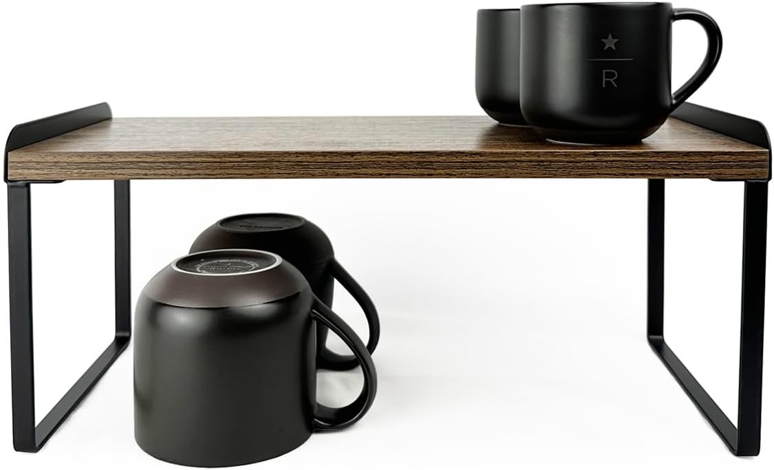 Mitus Shelf Organizer and Storage, Tiered Wood Cabinet Rack for The Kitchen Counter, Bathroom Counter, Pantry Cupboard, Office Desk Bookshelf, 16" Wide Walnut Brown and Black