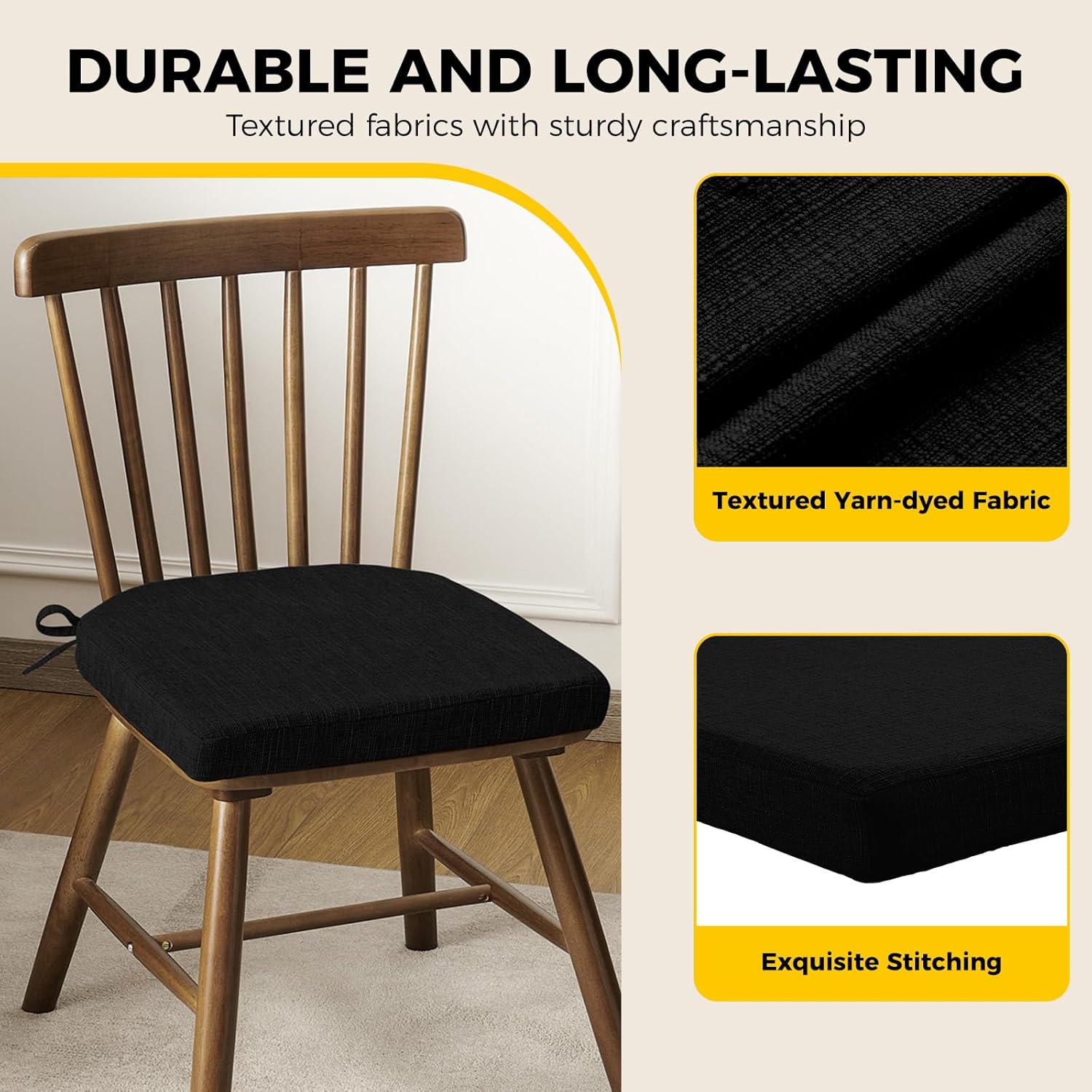 downluxe Indoor Chair Cushions for Dining Chairs, Soft and Comfortable Textured Foam Kitchen Chair Pads with Ties and Non-Slip Backing, 16" x 16" x 2", Black, 6 Pack