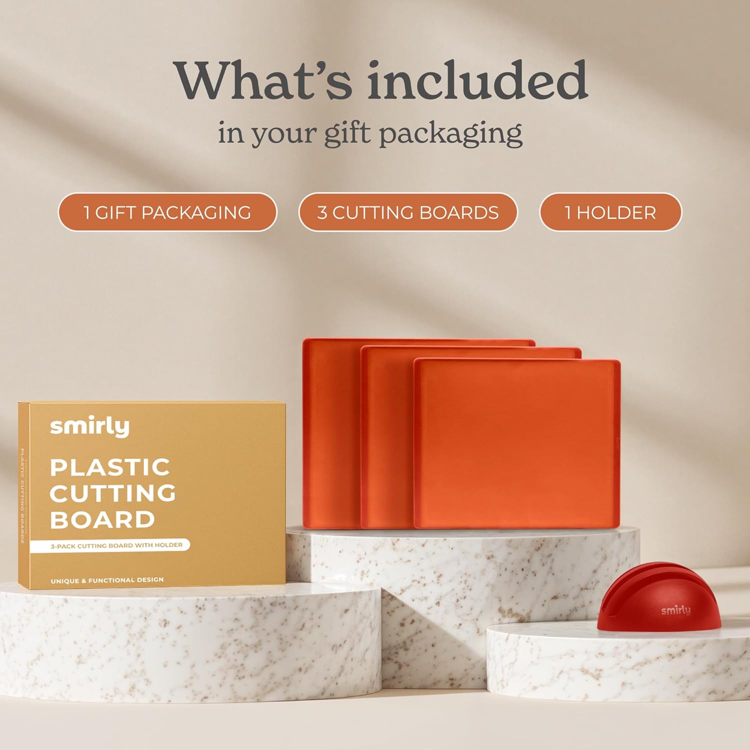 - 3-Pack with Holder: This cutting board set includes small, medium, and large cutting board sizes for every prep need. It also comes with a compact holder that neatly organizes all boards vertically, keeping your countertops clutter-free while ready for any chopping task.