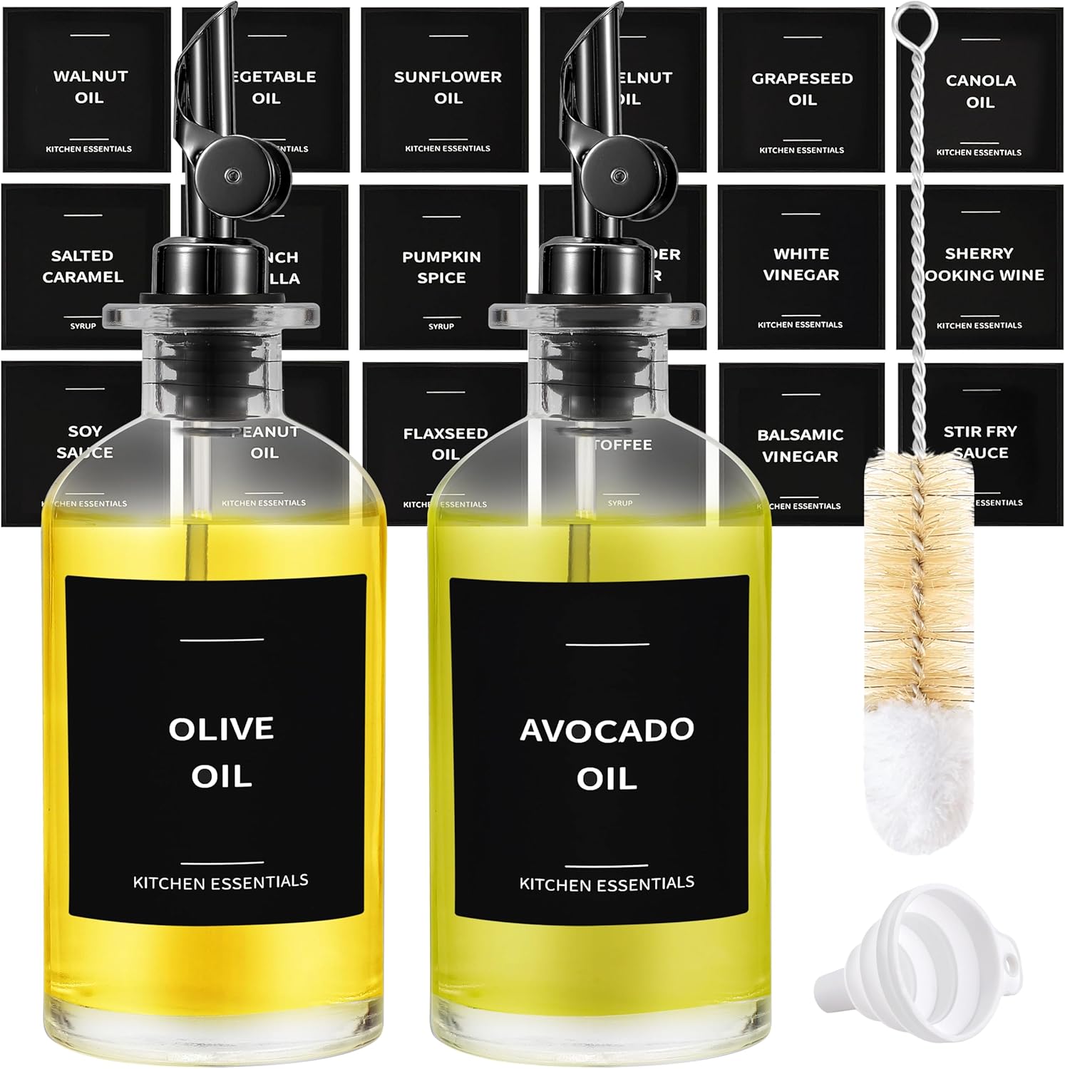 - Includes 55 Sticker Labels — Customize your glass oil dispenser thanks to the complimentary 55 waterproof and oil proof sticker labels made from PVC. Each label is minimalistic and clearly shows the contents of the bottle for convenience and decor.