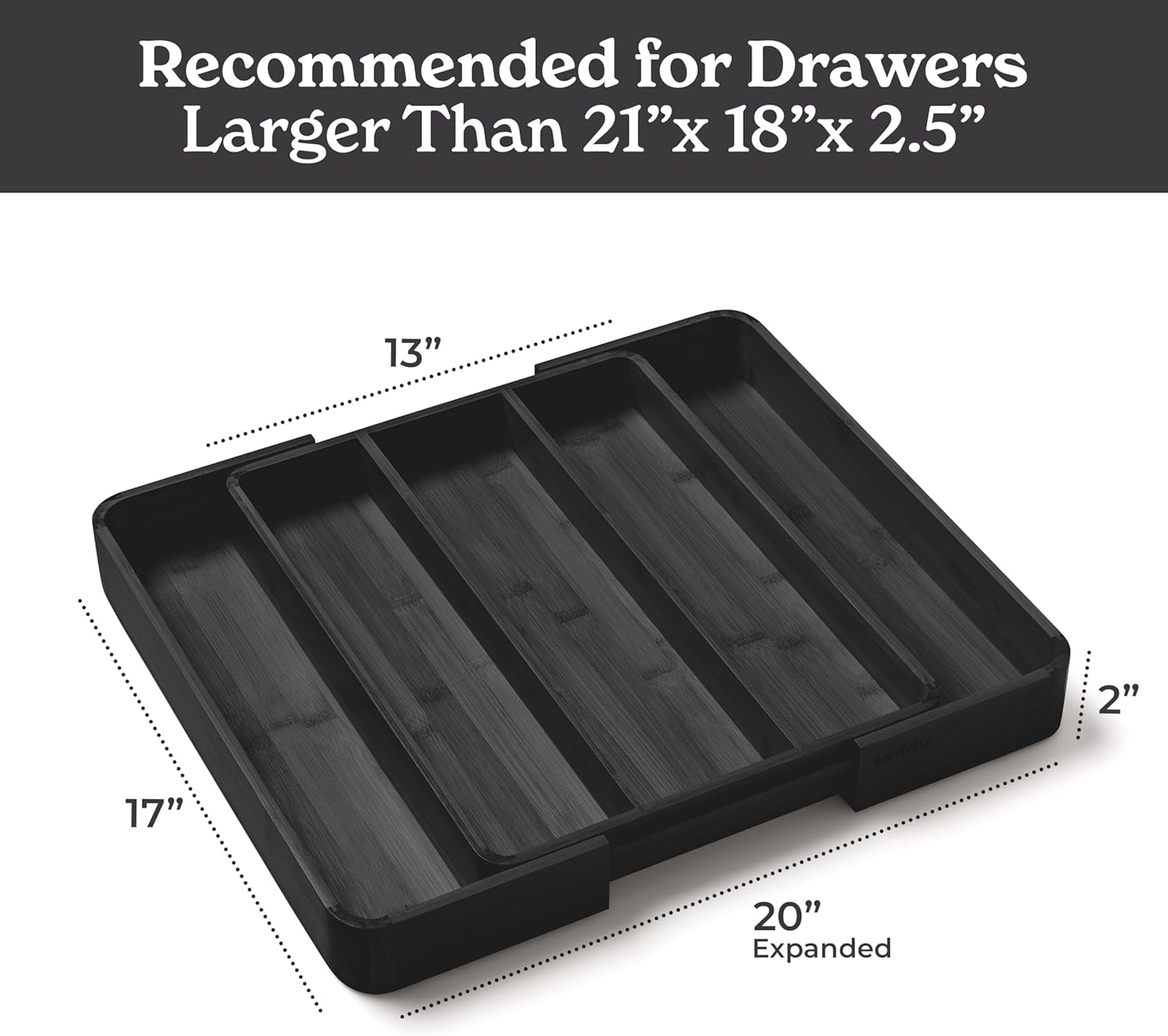- An Organizing Space Saver - Our 5-compartment expandable bamboo kitchen drawer organizer adapts to fit any drawer size, providing customizable storage for silverware and kitchen utensils. This versatile design keeps your kitchen neat and organized.