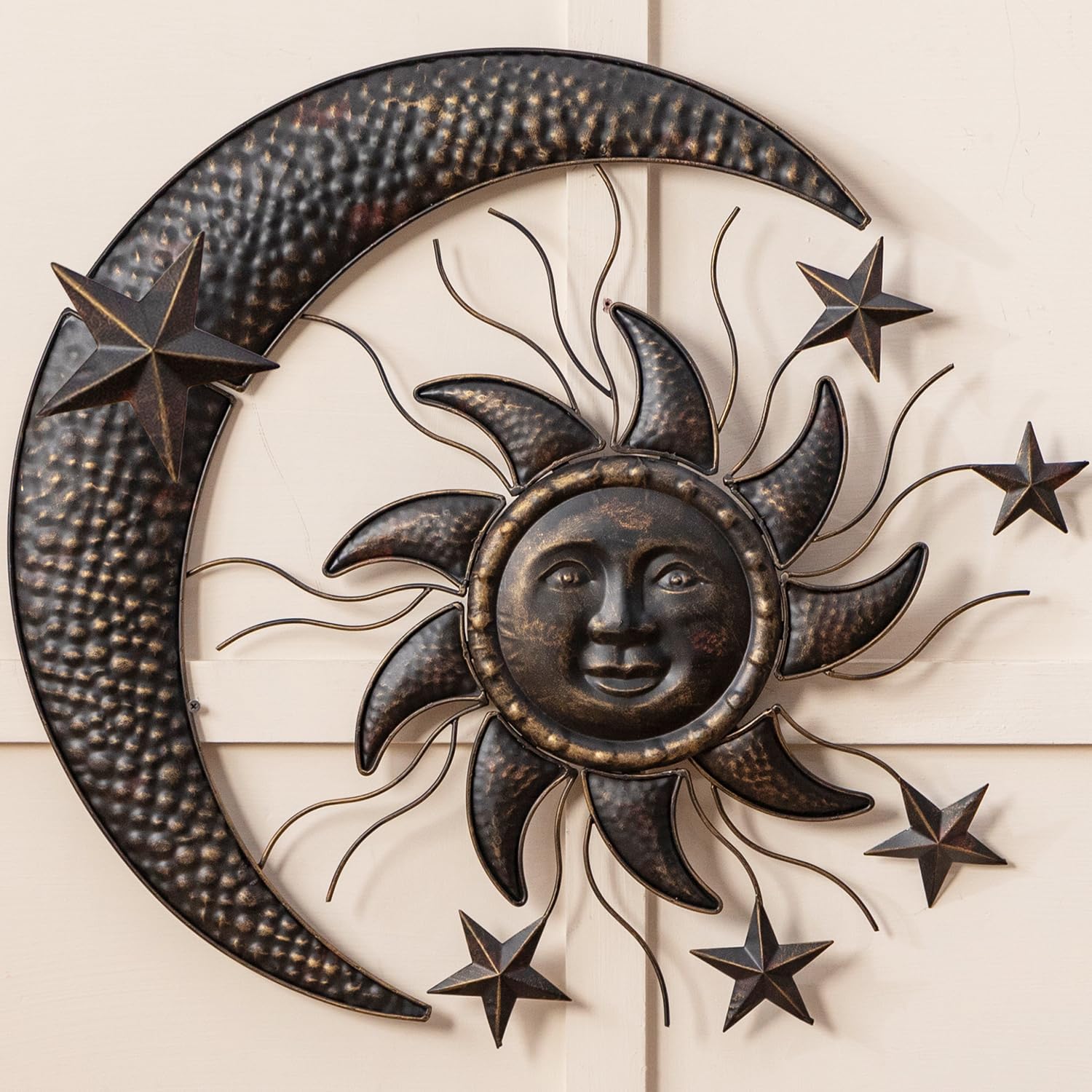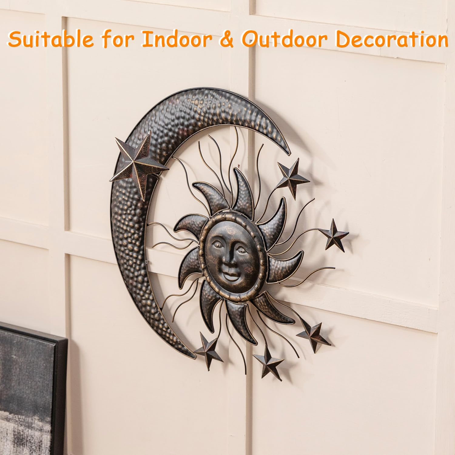TICKCACY 27” Metal Sun Wall Decor, Vintage Sun Moon Stars Wall Hanging Decoration, Moon and Stars Wall Art Sculpture for Indoor Outdoor Living Room Bedroom Garden Yard Patio Fence
