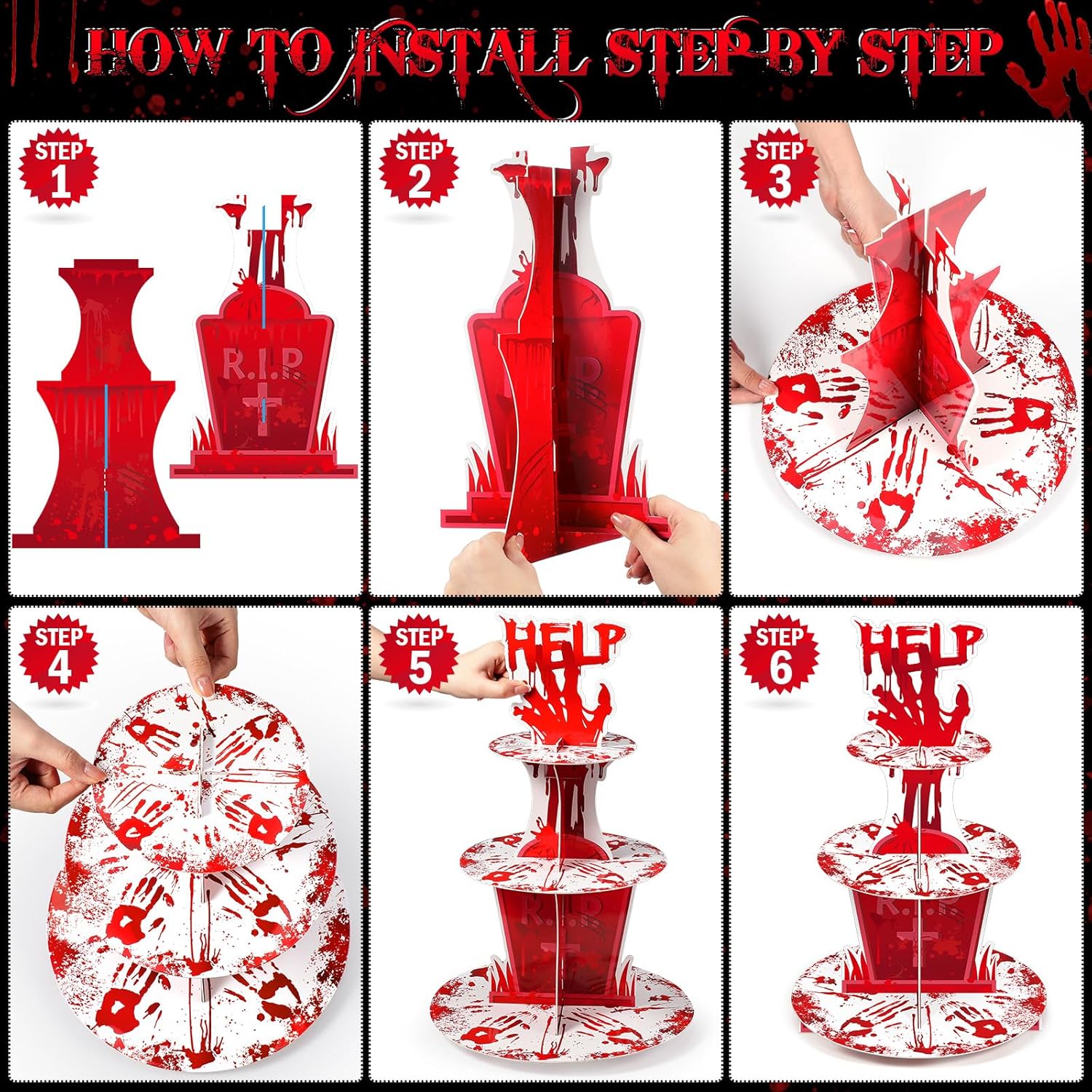 - Easy to Use: our Halloween bloody help dessert tower party decorations have no need to use other tools during assembly, and you can refer to the assembly steps in the pictures; Thick cardboard is fixed between every 2 layers of cake stands, and the groove cut matches the cardboard cut, easy to disassemble and store to save space