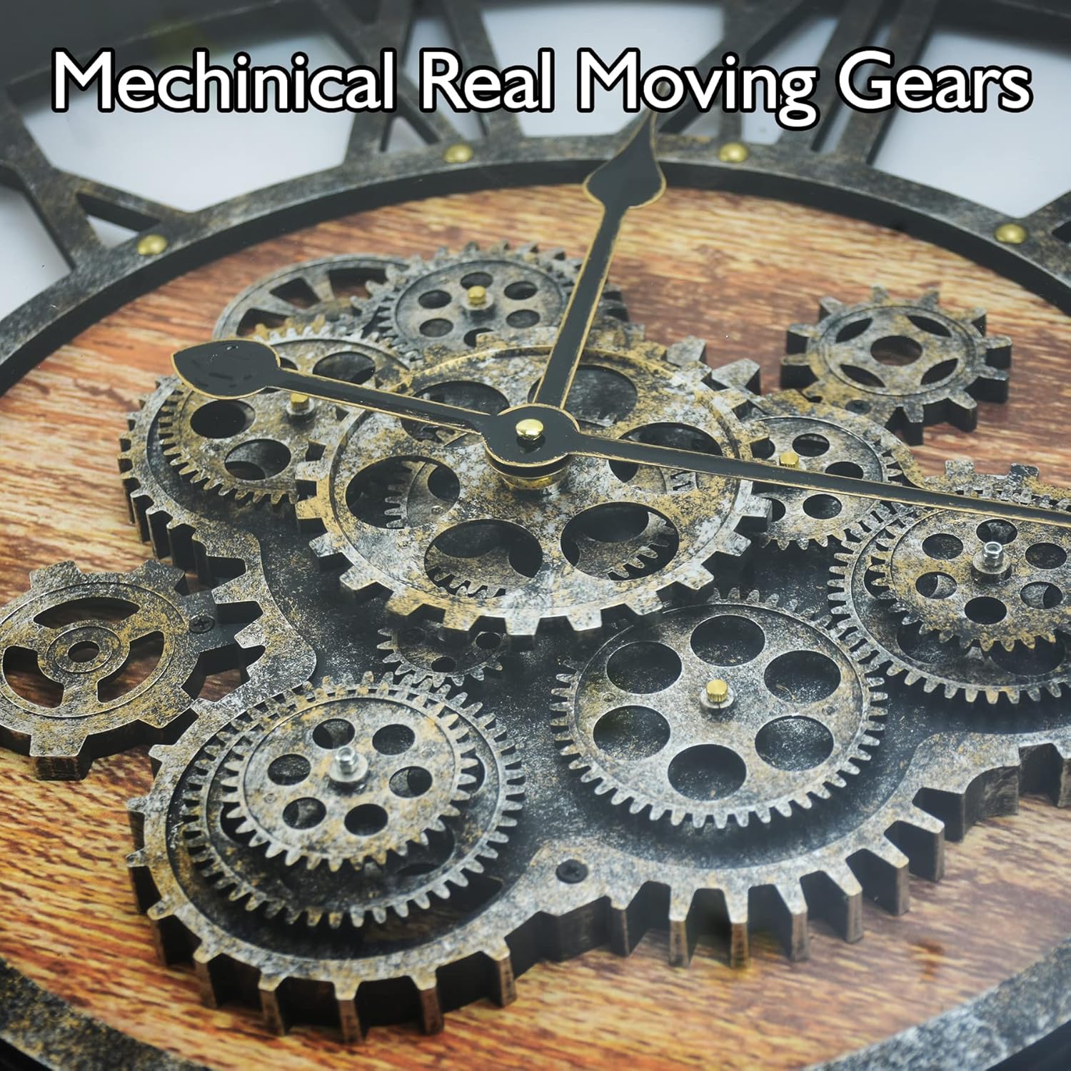 - đ§ăUnique Design, Only For Your Homeă Round solid Wood frame and classic retro skeleton with real mechanical moving gears in the central, the wooden frame is handcraft, showing unique attractive wood grain color and small natural knots; artificial rust-imitated treatment marks on the skeleton for vintage and industrial effect; stronger tempered glass resists any breakage and keeps safety whenever; The design is very different from other clocks, just to break the ordinary, only for your home.