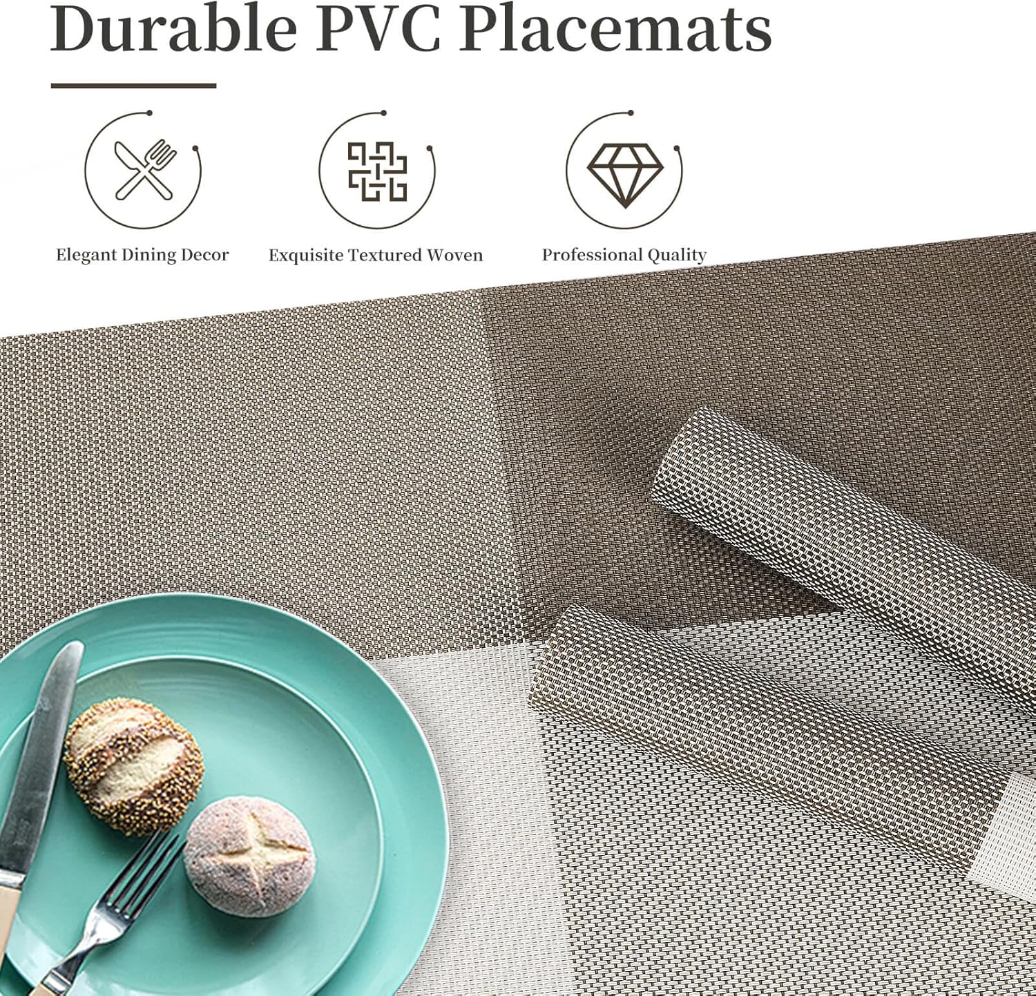 Vinyl Plastic Placemats Set of 6 Washable Heat Resistant Non-Slip Elegant Indoor Outdoor Kitchen Dining PVC Woven Table Place Mats (Light Coffee Lattice Block)