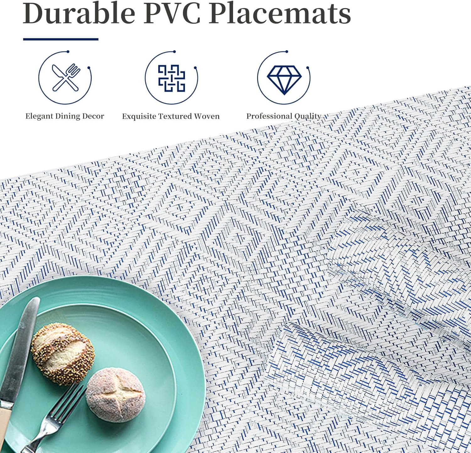 Vinyl Plastic Placemats Set of 6 Washable Heat Resistant Non-Slip Elegant Indoor Outdoor Kitchen Dining PVC Woven Table Place Mats (Blue Squares)