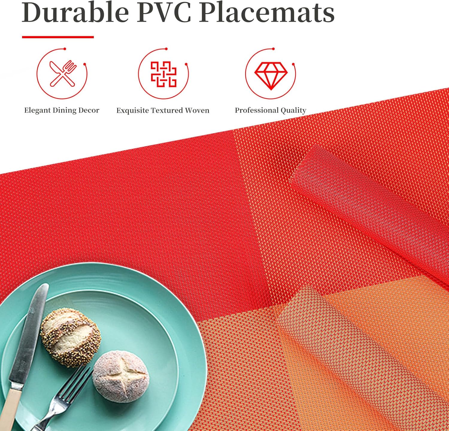 Vinyl Plastic Placemats Set of 6 Washable Heat Resistant Non-Slip Elegant Indoor Outdoor Kitchen Dining PVC Woven Table Place Mats (Orange Red Lattice Block)