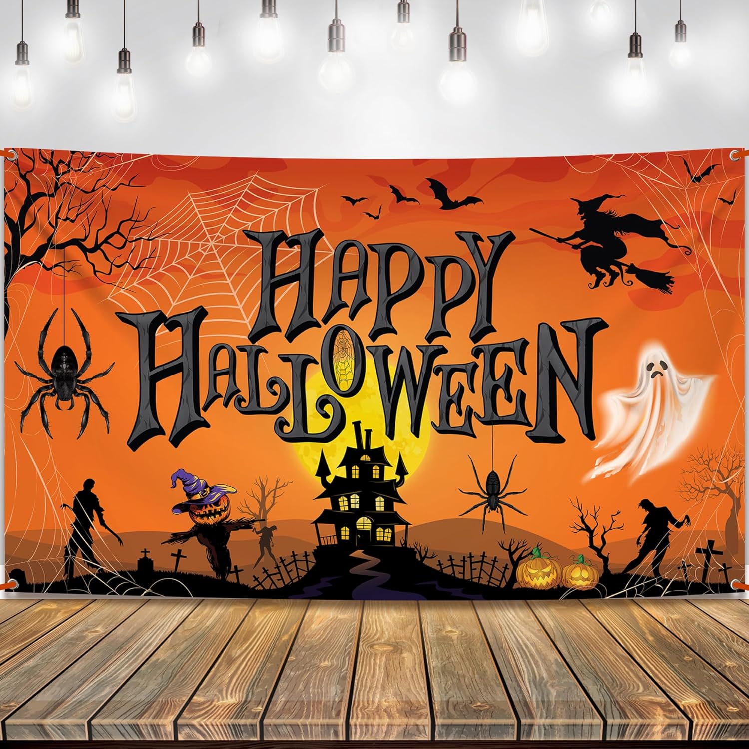 - PREMIUM QUALITY | DURABLE | REUSABLE : Crafted with an unwavering commitment to quality, the graveyard Happy Halloween Backdrop is made from durable premium grade 'A' cloth fabric materials. This ensures that the pumpkin banner is reusable so you can enjoy its enchanting allure year after year, making it a timeless addition to your scarecrow Happy Halloween decorations indoor. Decorate your walls with these Happy Halloween banners.