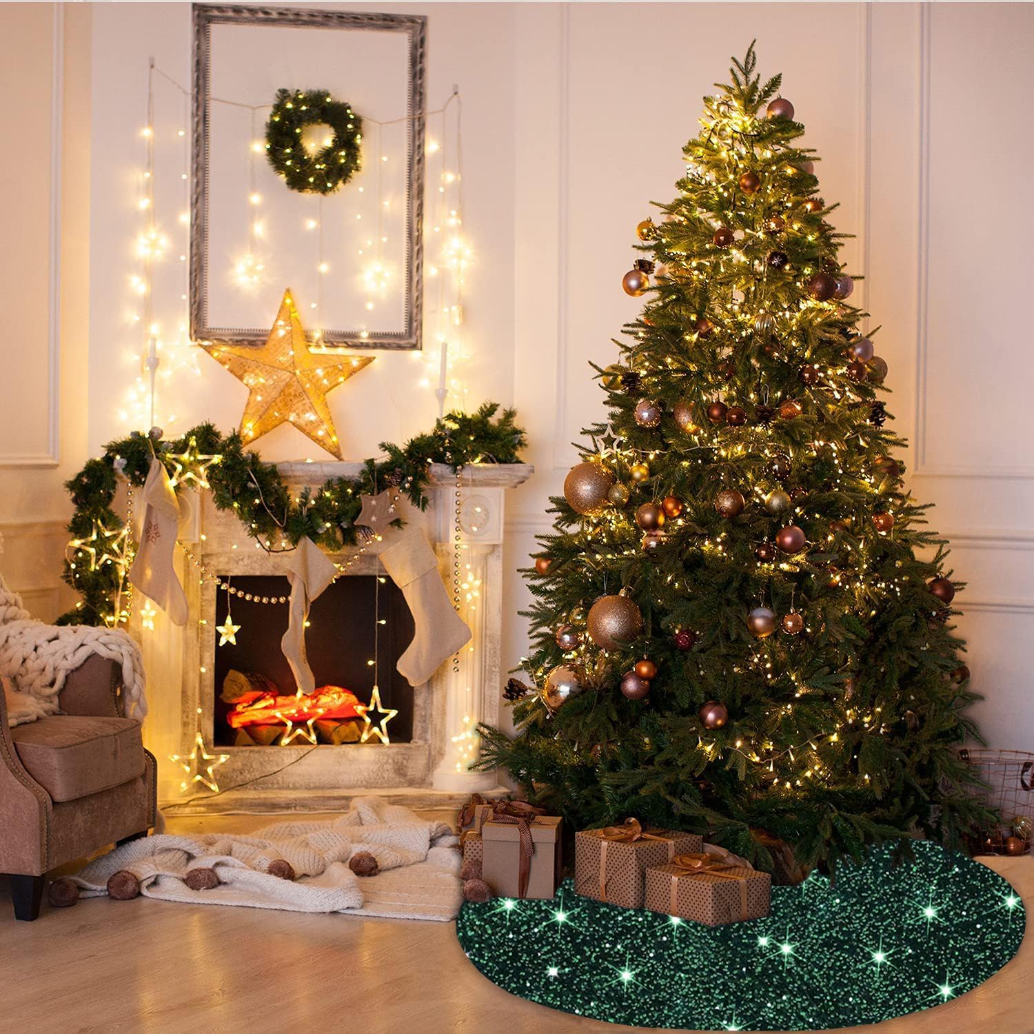 - ❄️【Size Detail - Velvet Tree Skirt for Christmas】You will receive a 21 inches diameter green black glitter sequins tree skirt, fits under 8 foot tall trees. You can put some gifts, Christmas boxes, Christmas ball on the xmas tree cover mat. The sparkle velour Christmas tree skirts is perfect for decorating your home and become part of your holiday tradition.
