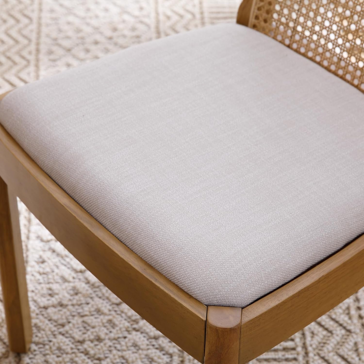 Mid Century Dining Chairs Set of 2, Accent Rattan Linen Fabric Side Chairs Kitchen Chair with Solid Wooden Legs for Living Room Dining Room, Beige