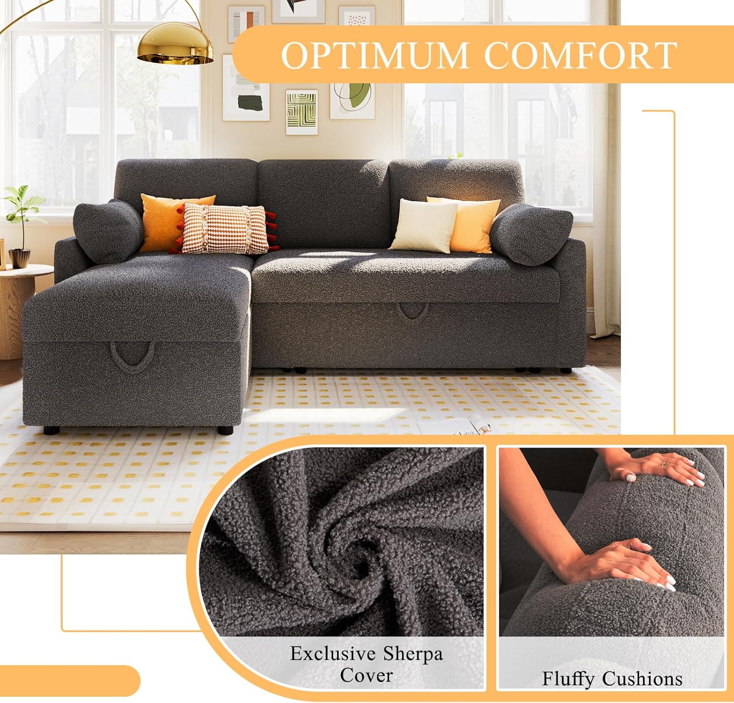 VanAcc Sofa Bed, Sleeper Sofa with Storage Chaise- 2 in 1 Pull Out Couch Living Room, Comfy Sleeper Couch, Grey Boucle