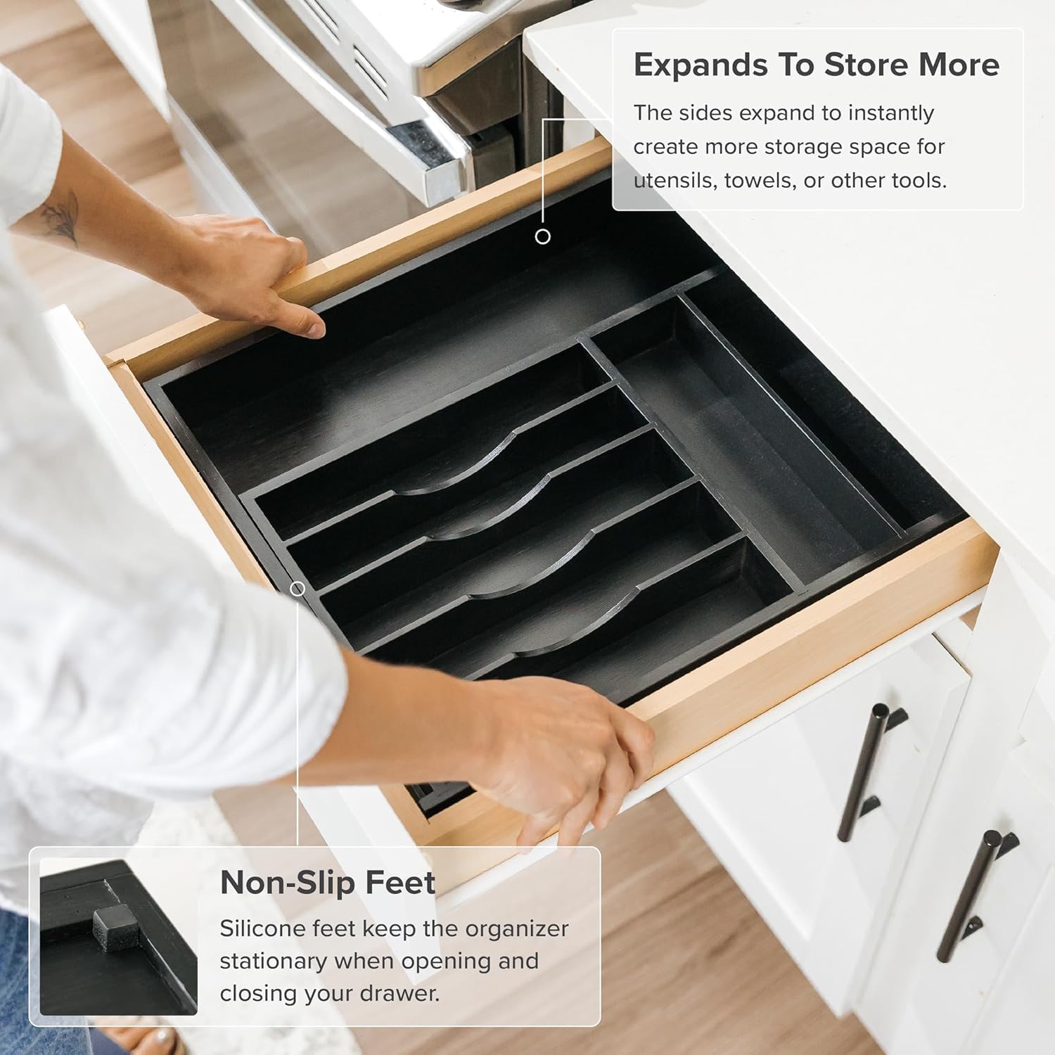 - Unmatched Innovation and Quality: At the pinnacle of innovation and quality, KitchenEdge black bamboo kitchen drawer organizers are an unmatched choice. Each organizer in our diverse lineup seamlessly integrates design and quality features that outshine other bamboo organizer manufacturers. Produced on the same superior production line with consistent ultra-premium quality specifications, our organizers offer a uniform aesthetic and performance.