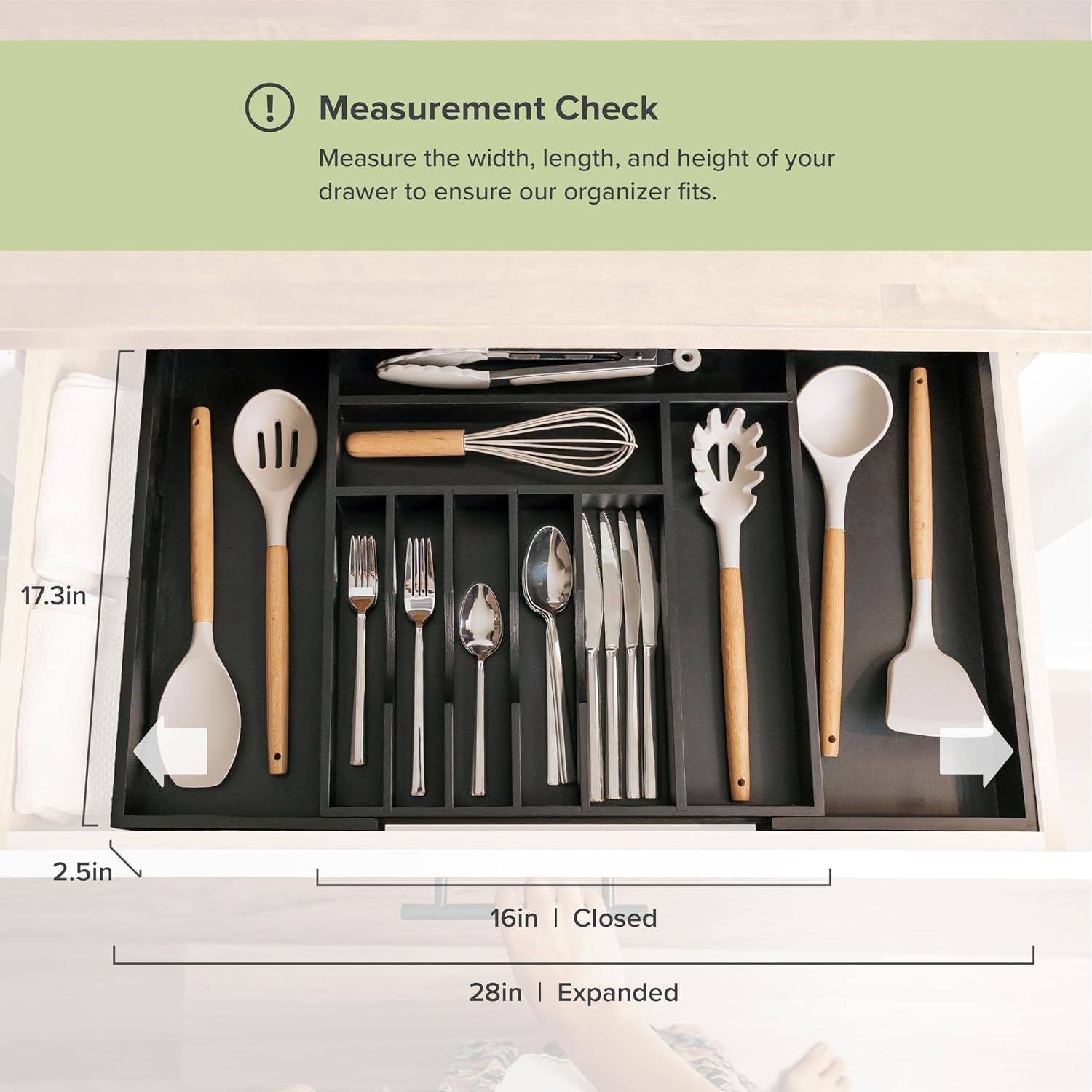 Premium Silverware, Flatware and Utensil Organizer for Kitchen Drawers, Food-Safe Contract Grade, Expandable from 16 to 28 In, Black Bamboo