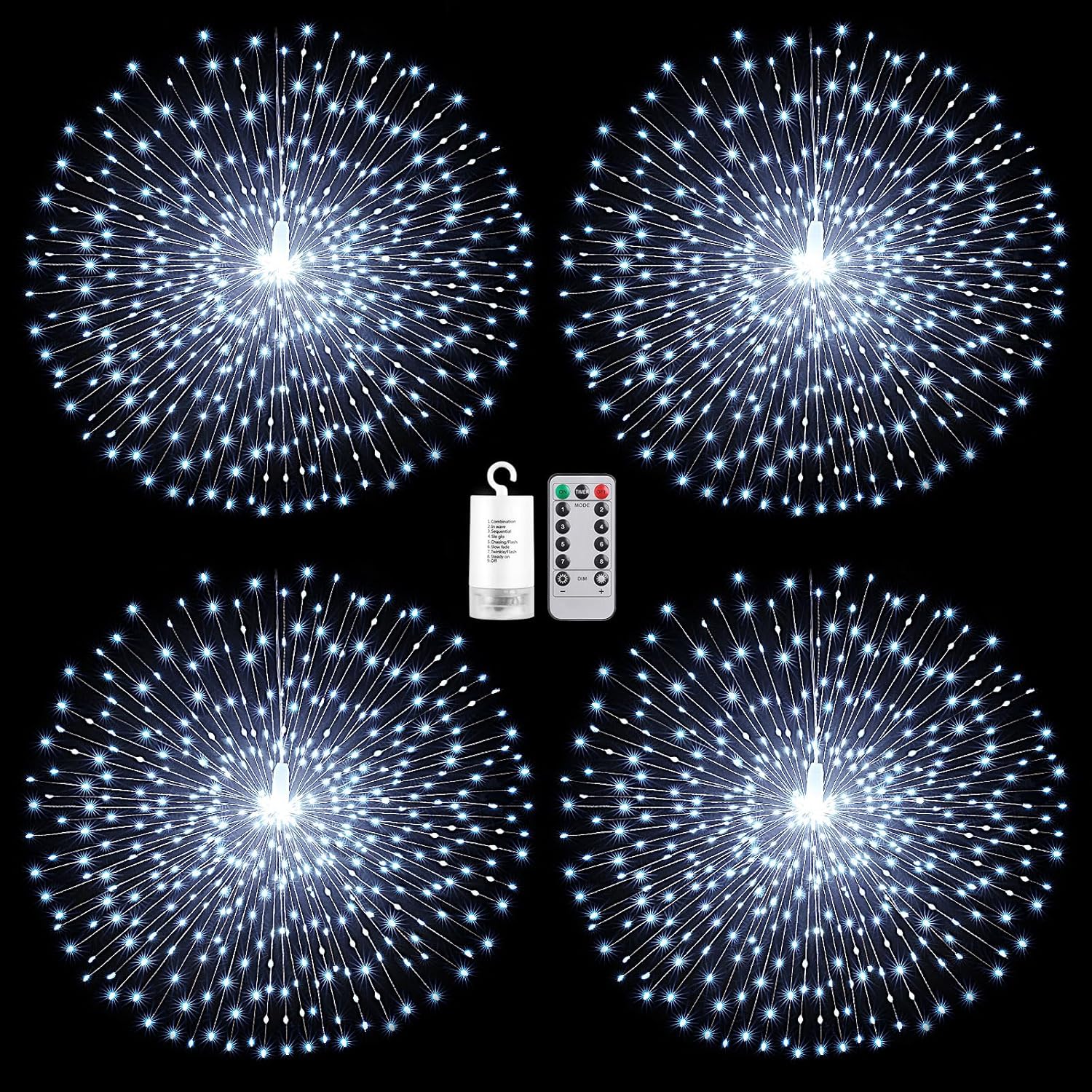 - 8 Modes Hanging Fairy String Lights with Remote: There are 4pack christmas lights with remote,effective receiving range is 10-15 meter.Support range remote control to control 8 different modes (Combination, In wave, Sequential, Slo glo, Chasing/Flash, Slow fade, Twinkle/Flash, Steady on).To avoid forgetting to turn off the string lights, you can set timer by pressing the TIMER button, the timed fairy Lights can be set to automatically turn on for 6 hours and turn off for 18hours