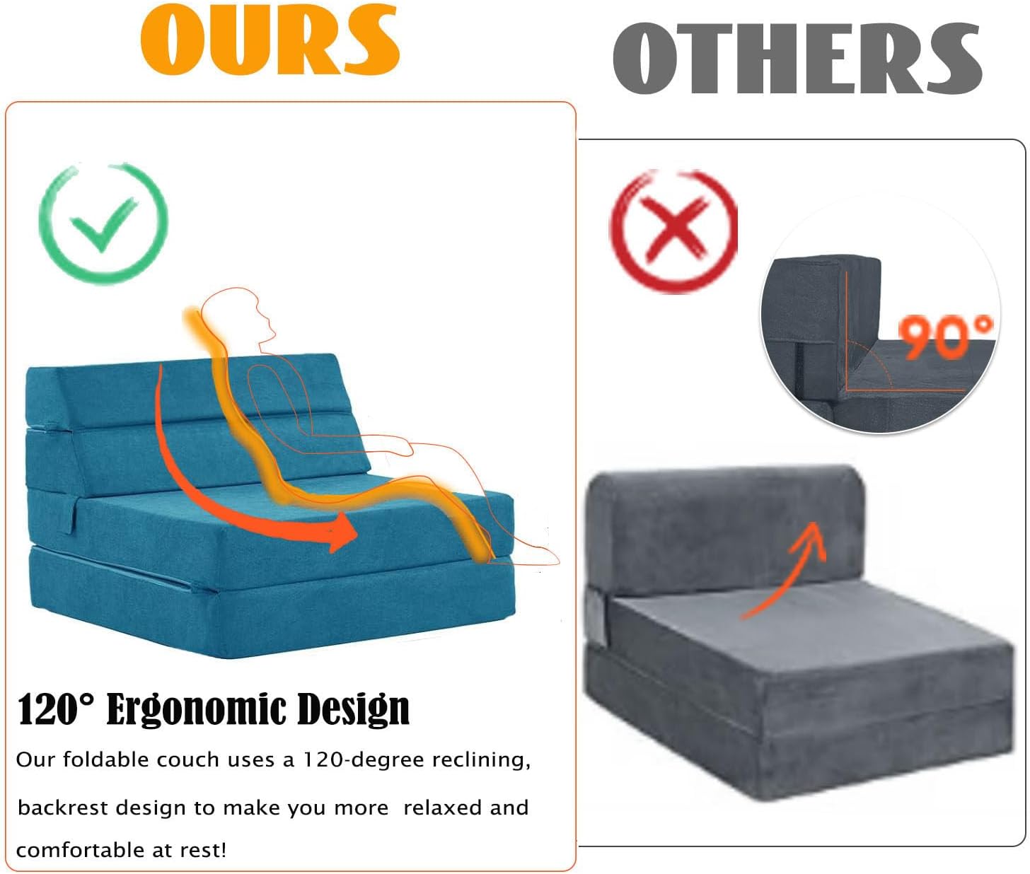 - 120 Degrees Ergonomic Design: Our folding sofa 's meticulously designed 120°reclining backrest is perfectly contoured to fit the curves of your body, providing you with unparalleled comfort and support. Compared to the common 90 degrees pull out couch backrest found in the market, our foldable couch 120 degrees inclination reduces pressure on the back and enhances relaxation. Say goodbye to discomfort!