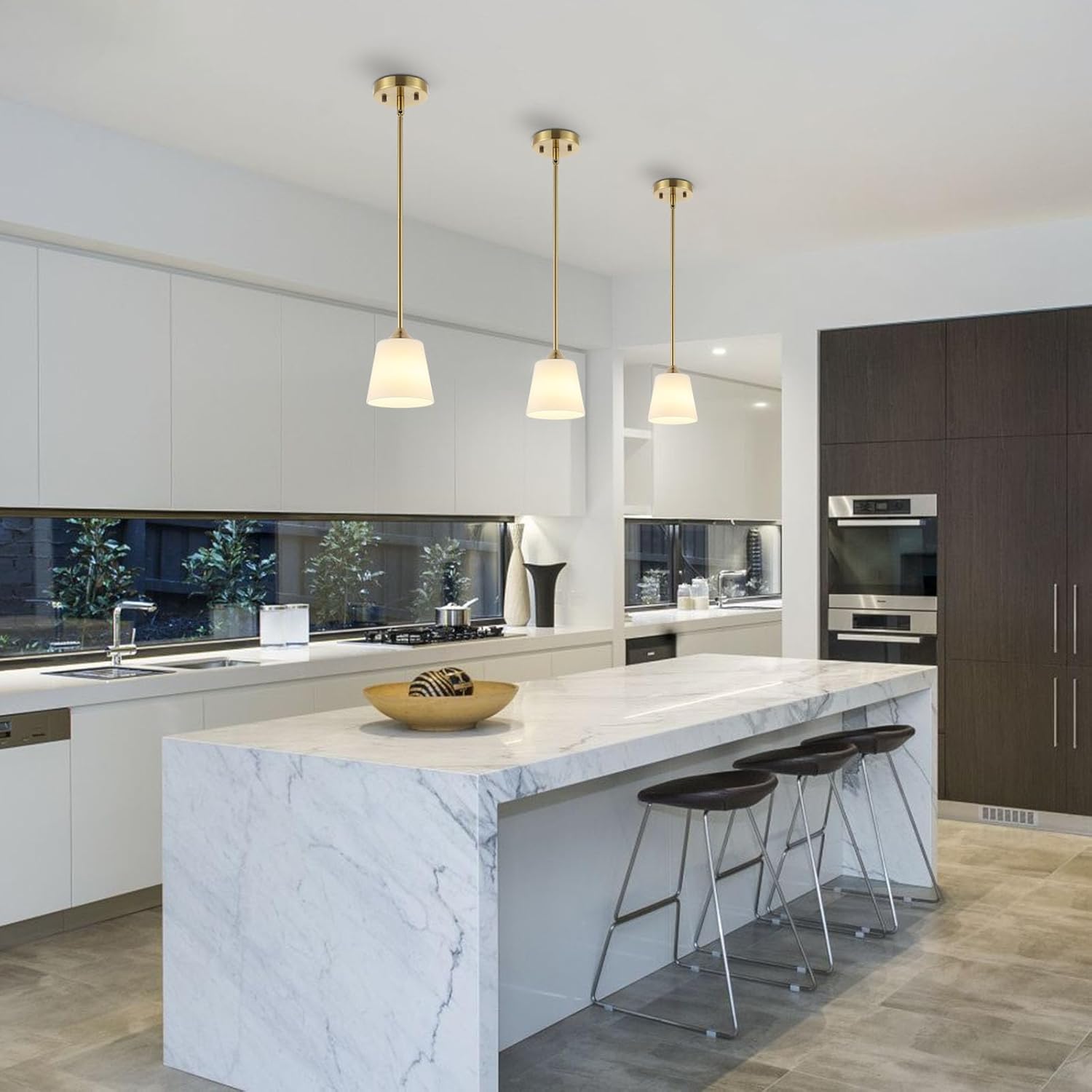 Modern Gold Pendant Light 3 Pack Brushed Brass Mid Century Chandelier White Cylinder Glass Shades Adjustable Rods Farmhouse Ceiling Hanging Lighting Fixture Kitchen Island Dining Room Bedroom