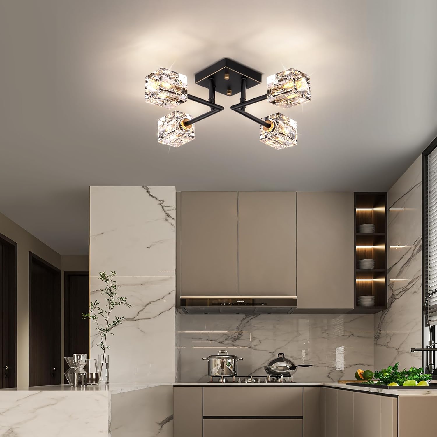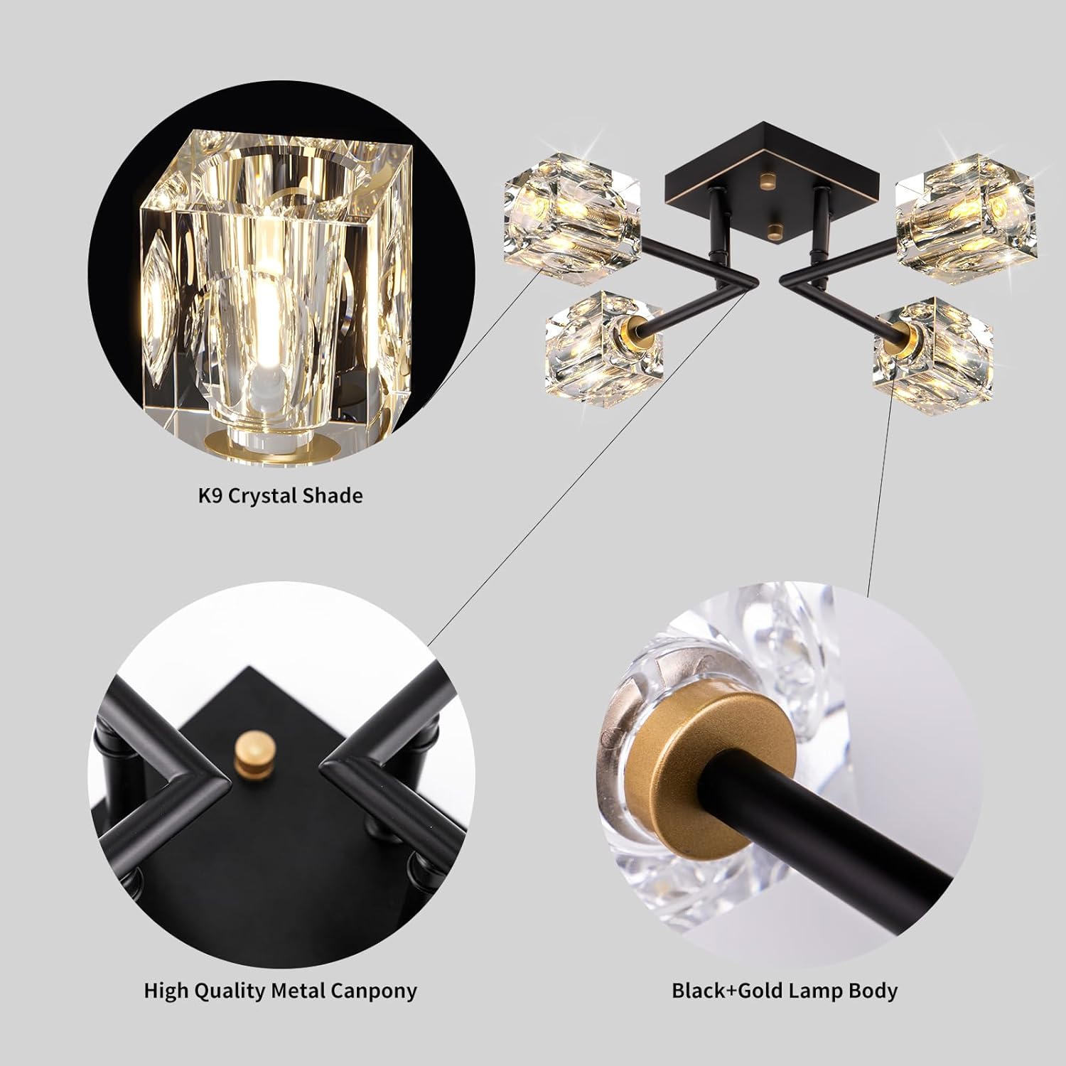 - 【Sputnik chandeliers Design】:This semi flush mount ceiling chandelier light fixture combination of black and gold modern geometric metal and four exquisite clear square K9 crystal lampshades,Showcasing a stylish and elegant appearance.The contrast between the balck and gold metal and crystal lampshades blends modern and farmhouse classic elements,creating a unique and refined decorative effect that perfectly embodies modern style