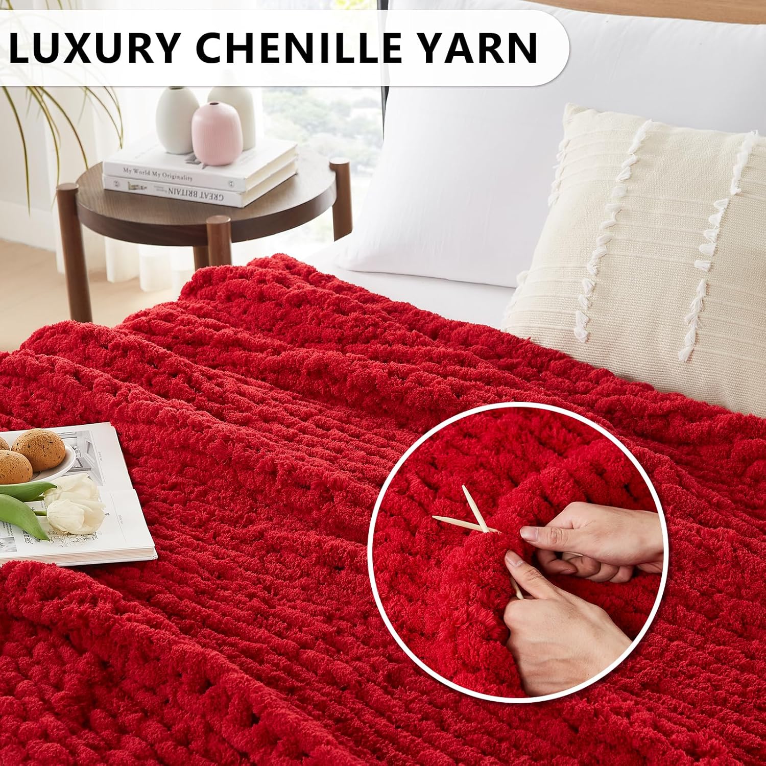 L'AGRATY Chunky Knit Blanket Throw - Soft Chunky Throw Blanket 40x50: 100% Hand Kintted Chenile Crochet Blanket Large Cable Knit Chunky Blanket - Rope Knot Throw Blanket for Couch Home Decor(Red)