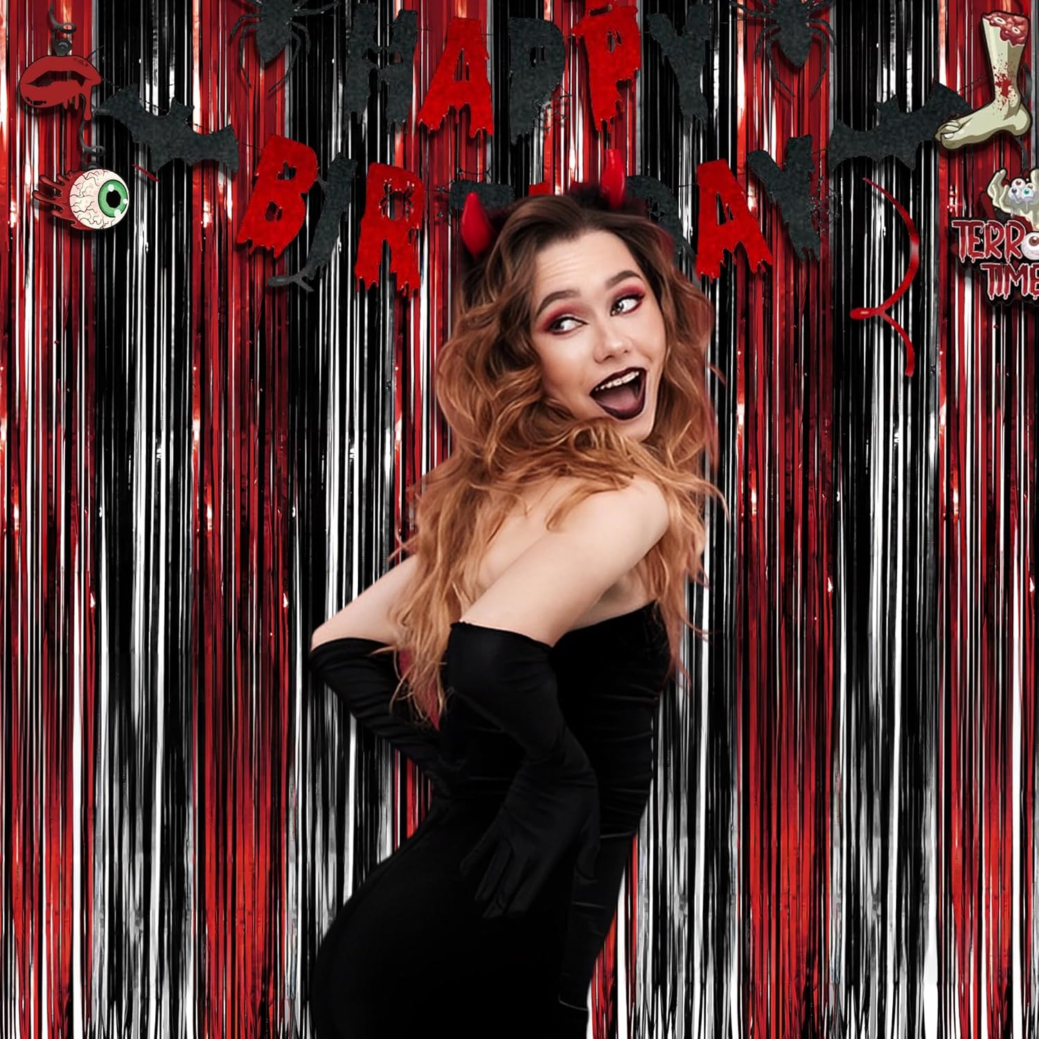 Black Red Party Streamers Backdrop - GREATRIL Foil Fringe Tinsel for Stranger/Friday Party/Halloween Party Decorations - 3.2ft X 8.2ft - 2 Packs