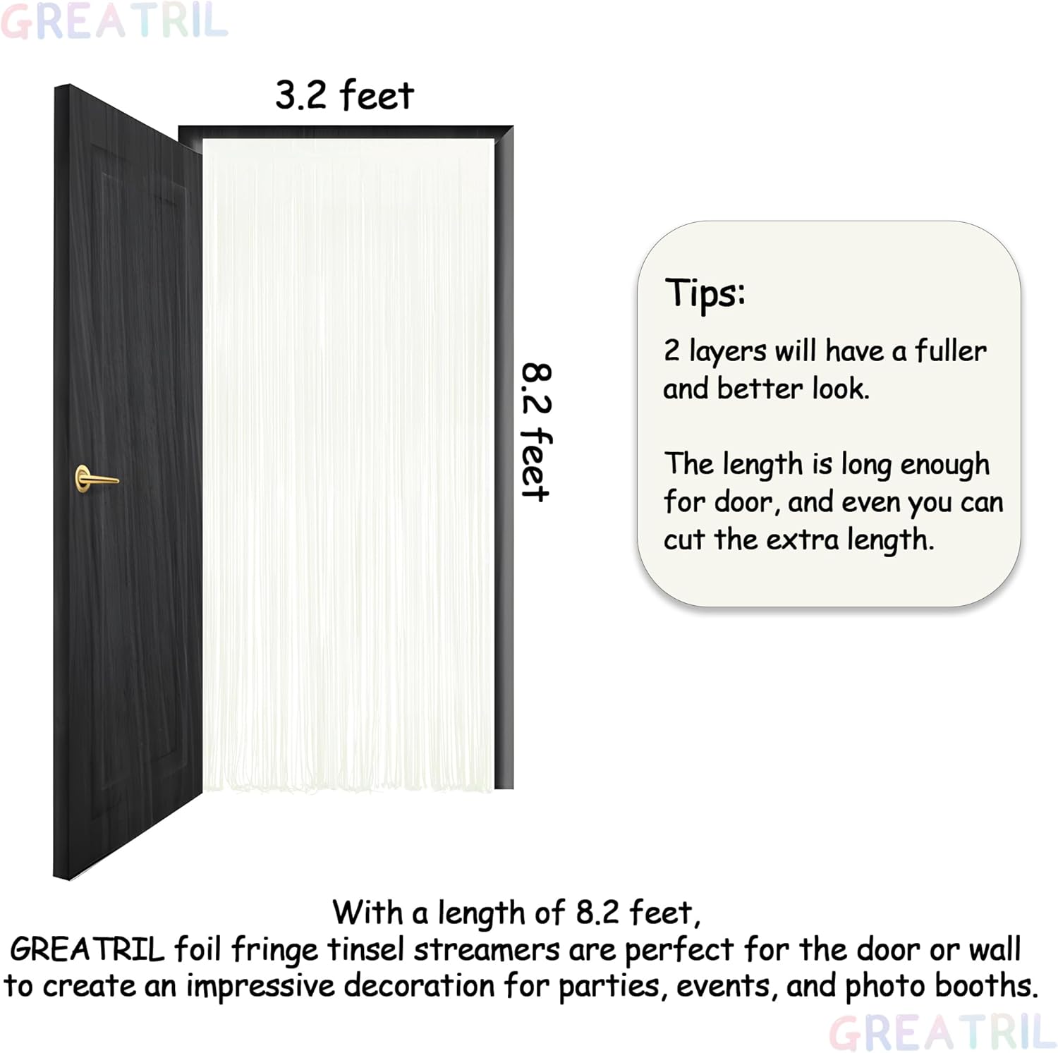 - Measuring 3.2ft x 8.2ft each and available in packs of 2, our streamers are designed to effortlessly adorn party walls or doors, creating a stunning and photo-worthy backdrop that beautifully enhances the ambiance.