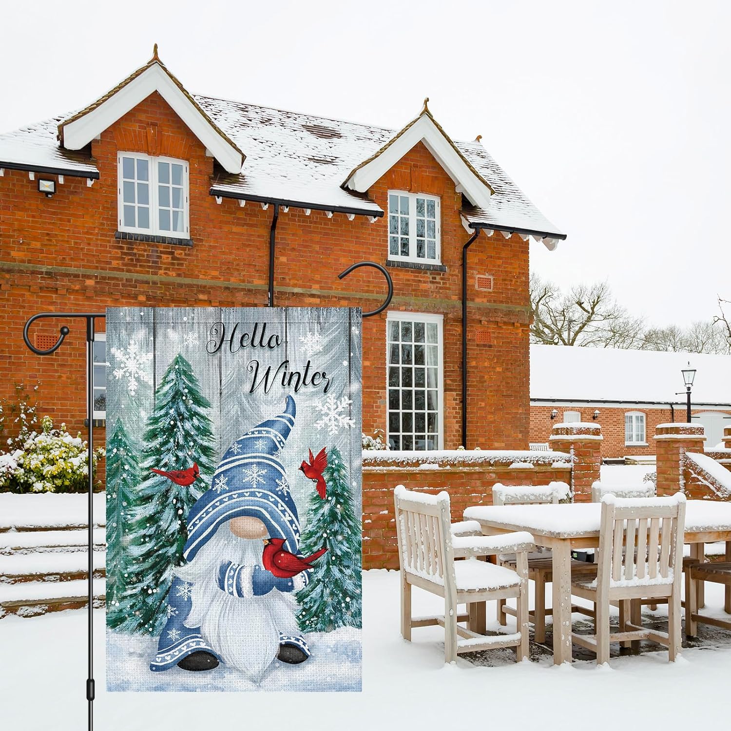 Hello Winter Gnome Garden Flag 12x18 Double Sided Burlap Cardinals Snowflakes Snow Yard Flags for Christmas Seasonal Outside Outdoor House Decoration (ONLY FLAG)