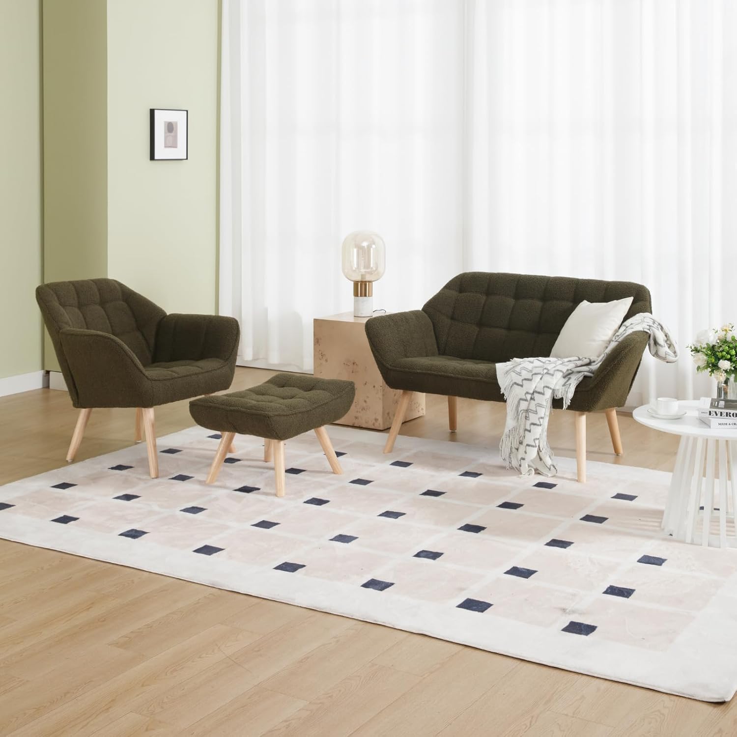 Modern Sherpa Accent Chair with Ottoman, Fluffy Upholstered Lounge Chair with Footrest, Comfy Living Room Side Boucle Armchair for Small Space Bedroom Apartment, Green