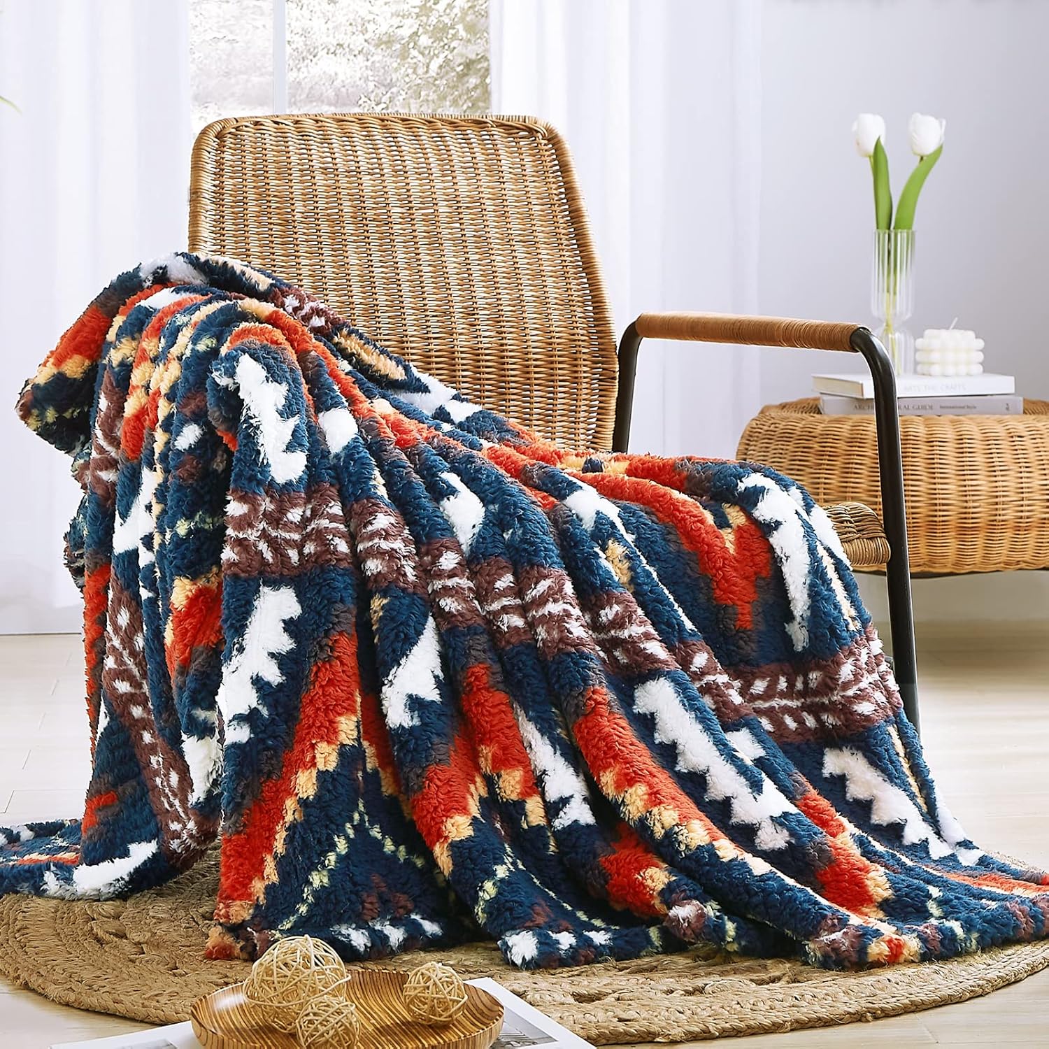 CASAAGUSTO Boho Sherpa Throw Blanket, Aztec King Size Blanket, Ultra Soft, Warm, Cozy, Plush, Thick Fleece Bohemian Throw Blanket for Couch, Bed, Sofa (Navy 108 * 90 Inch)