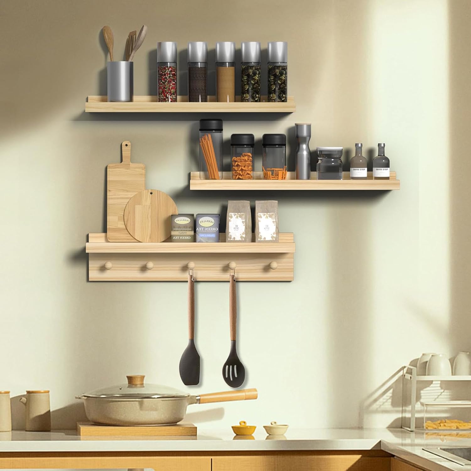 MBYD Natural Wood Floating Shelves, Unfinished Wood Picture Ledge, 24 Inch Picture Ledge for Kids Room, Floating Nursery Book Shelf with Hooks for Living Room, Kitchen, Bathroom
