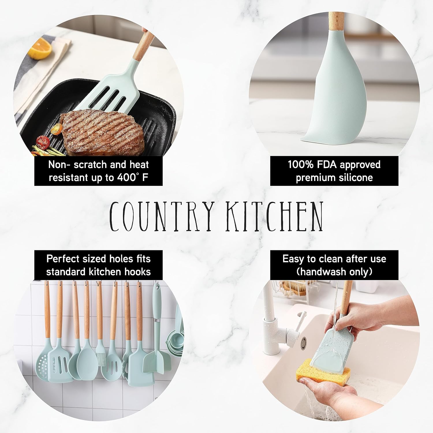 - Country Kitchen will give you all the reasons to LOVE your kitchen utensils! Cook, bake and serve with this fashionable cooking tool set that is sturdy and easy to clean! Kitchen beauties that won't disappoint!