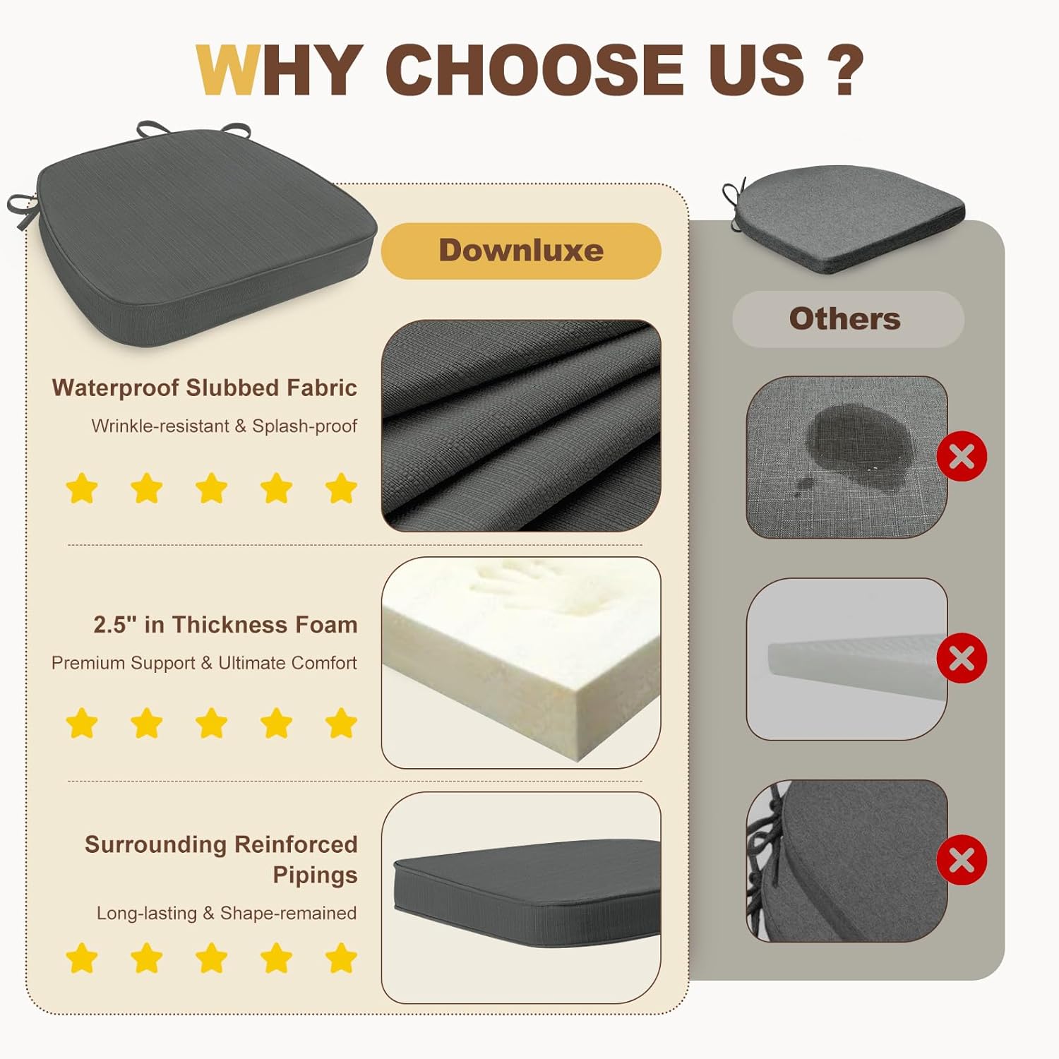 downluxe Chair Cushions for Dining Chairs, Waterproof Kitchen Chair Pads, Non-Slip Dining Seat Cushion with Ties, 17" x 16" x 2.5", Dark Grey, 4 Pack