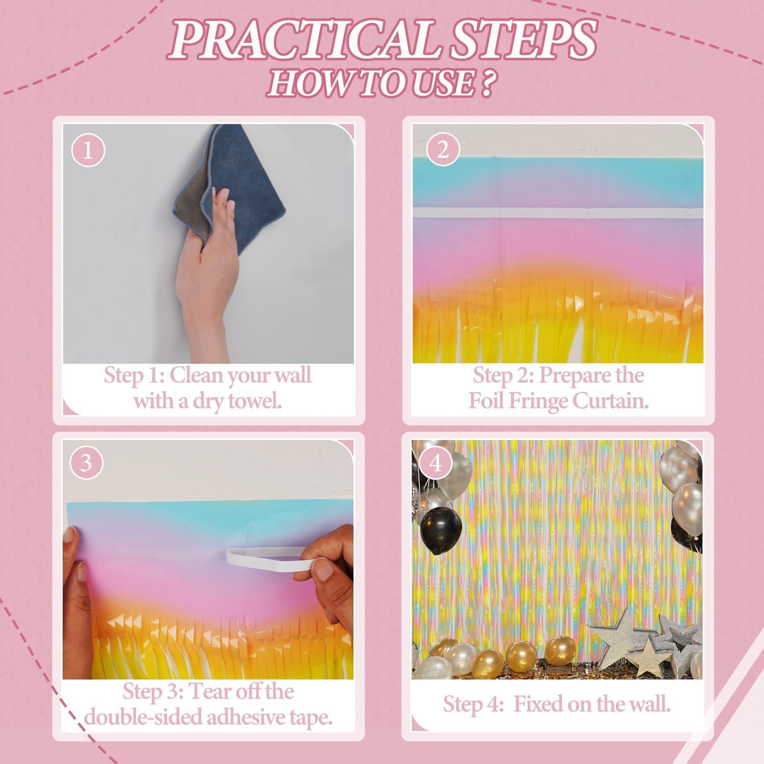 - 【Easy and Convenient Installation】These foil fringe curtains are easy to install and can be quickly hung on smooth surfaces using the included double-sided adhesive tape. No extra tools or materials required.